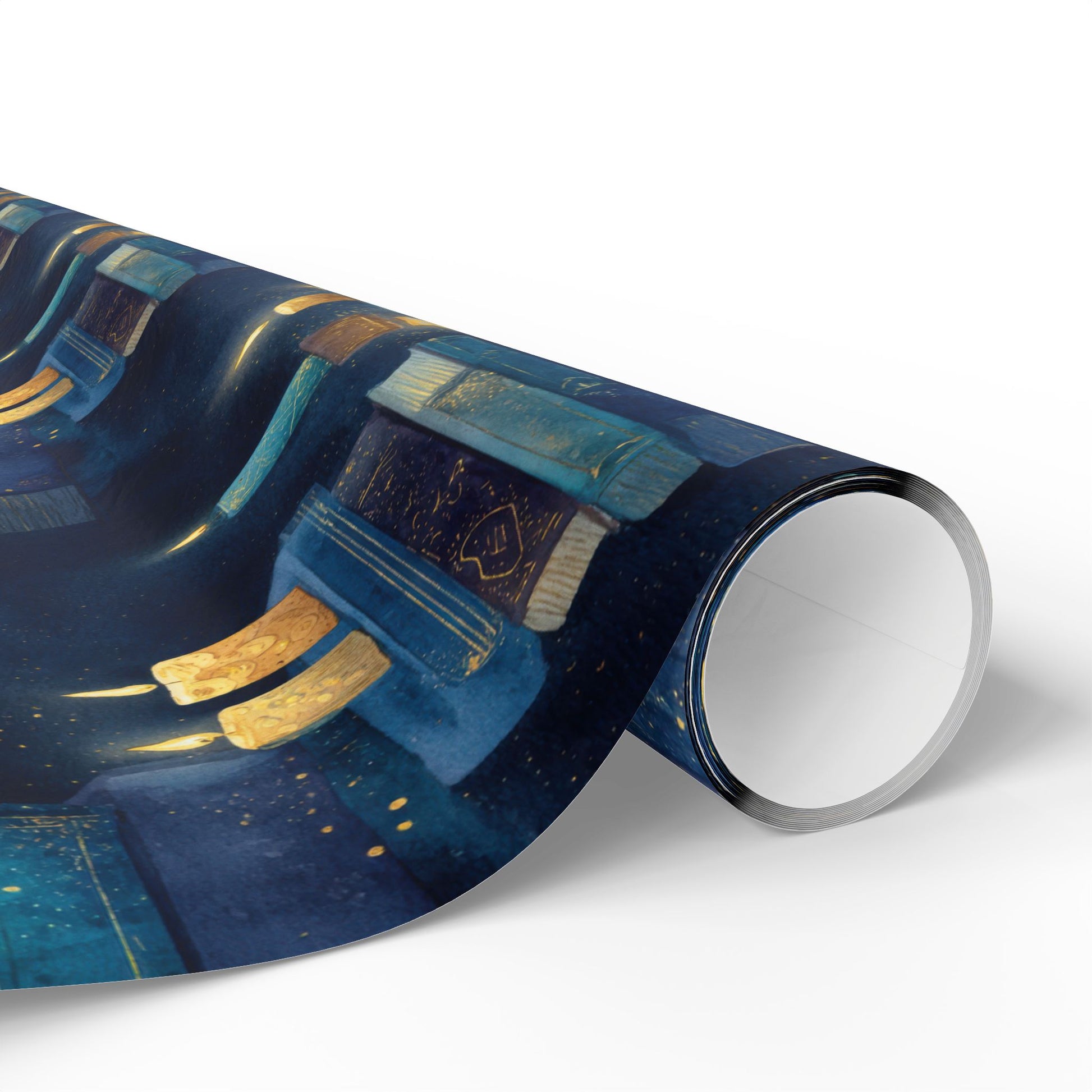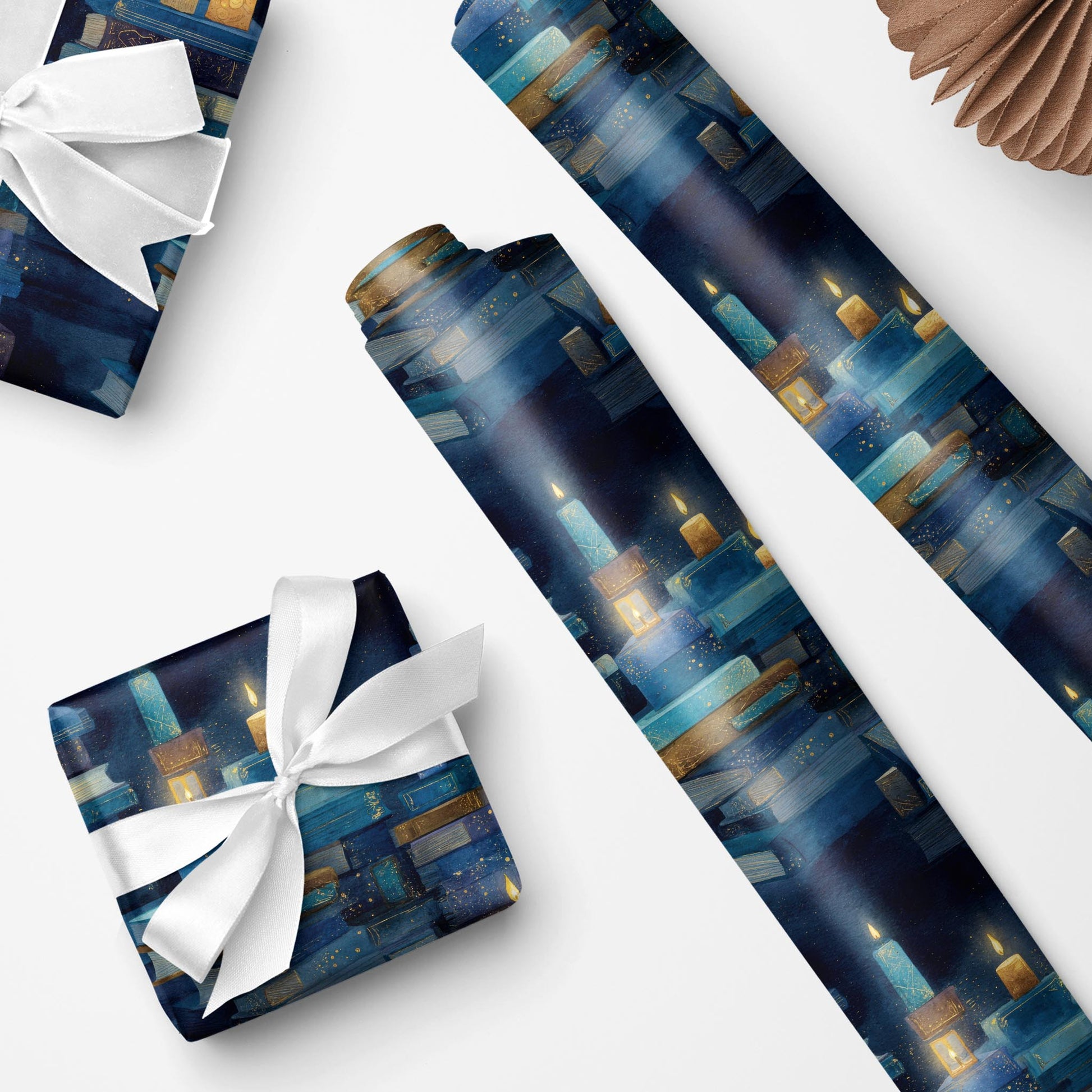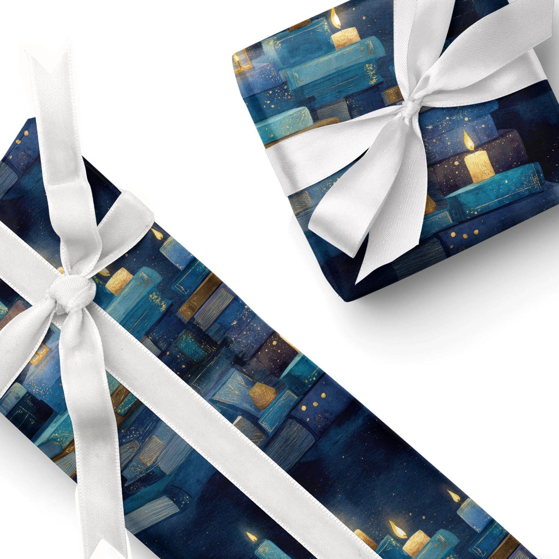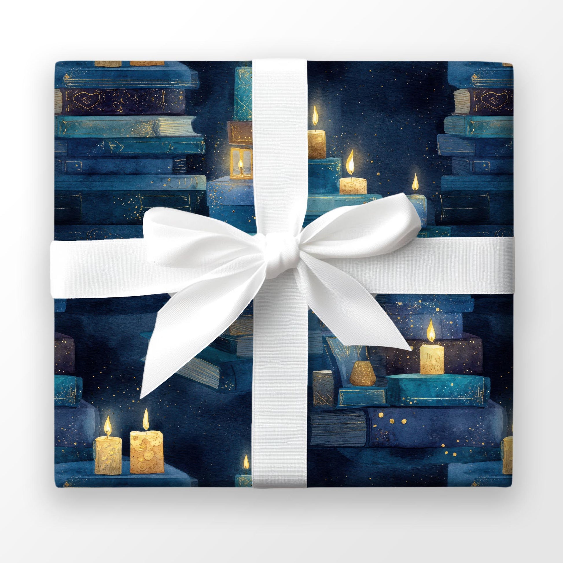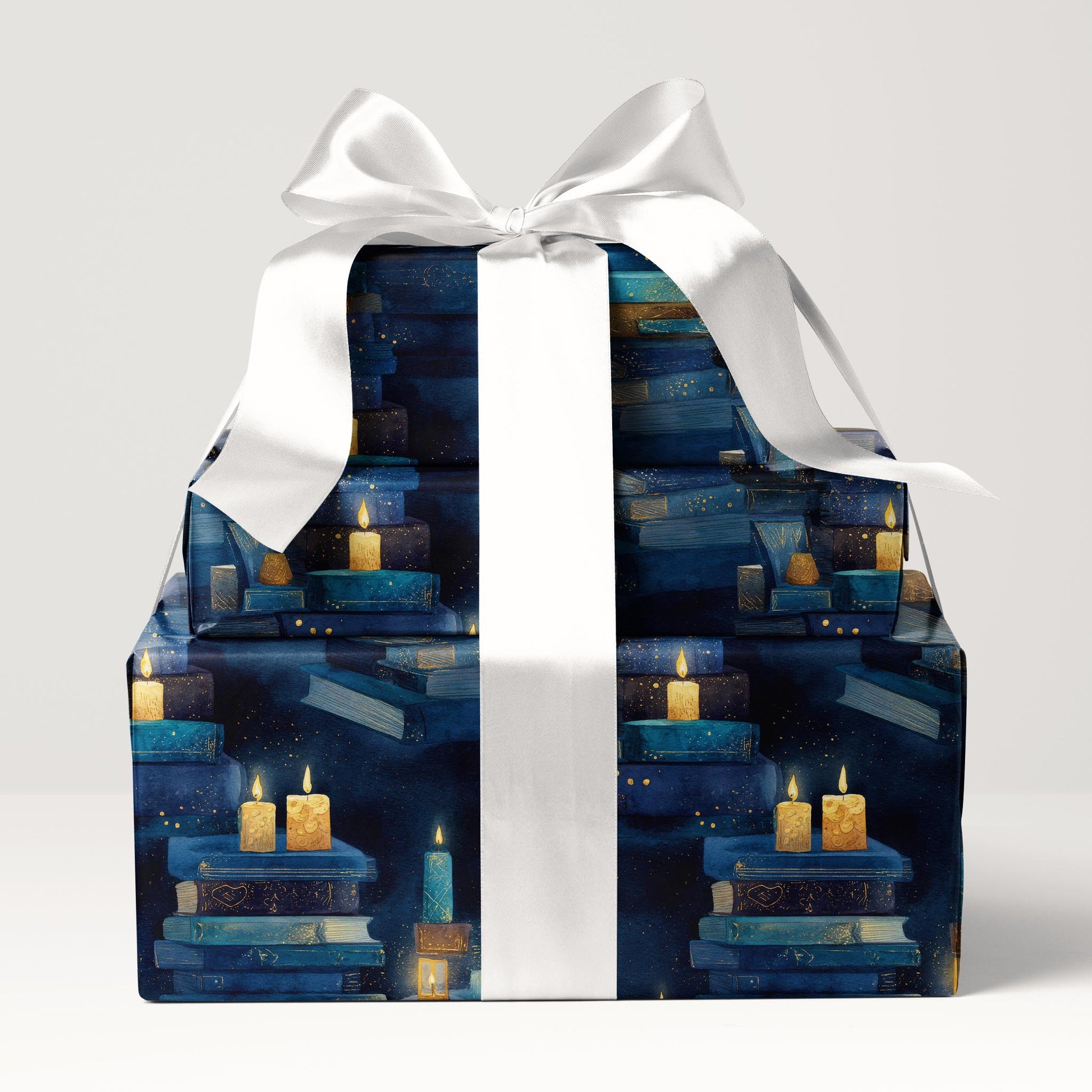 Glowing candles crown stacks of worn books in this warm watercolor repeat. Candlelit Stories is a timeless wrap for readers, autumn gatherings, or cozy gift giving.