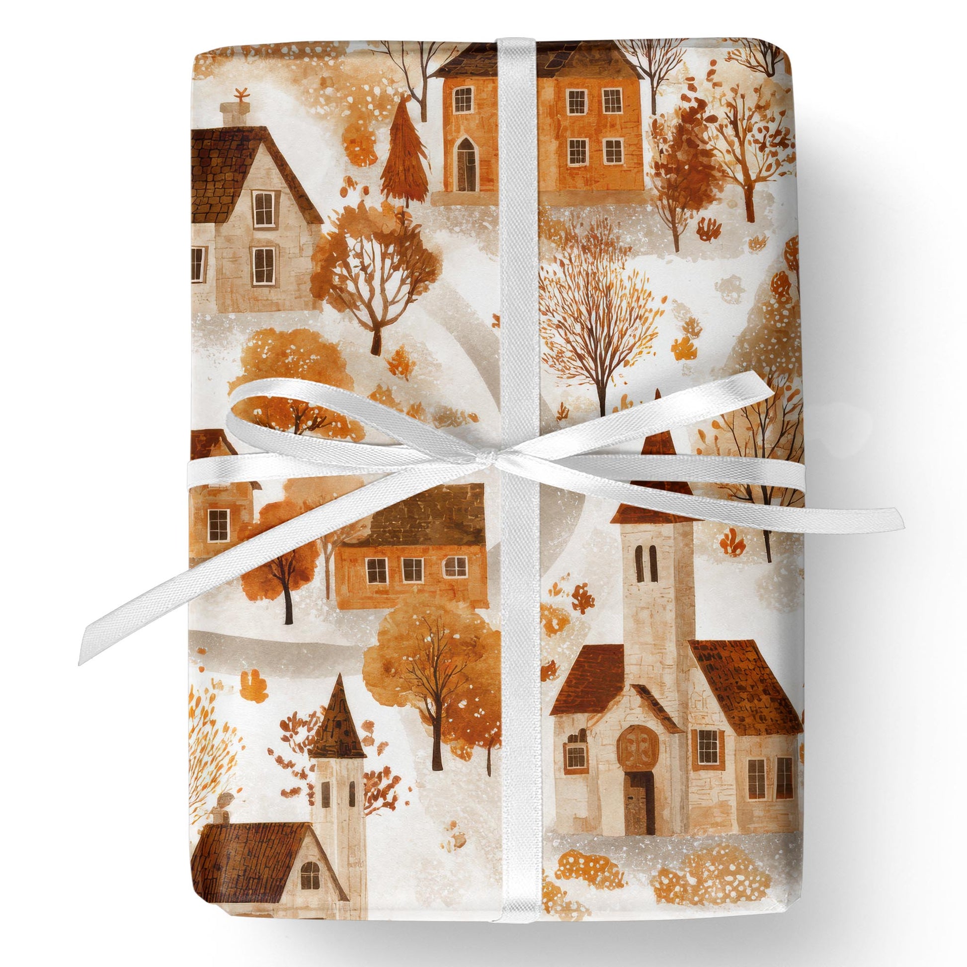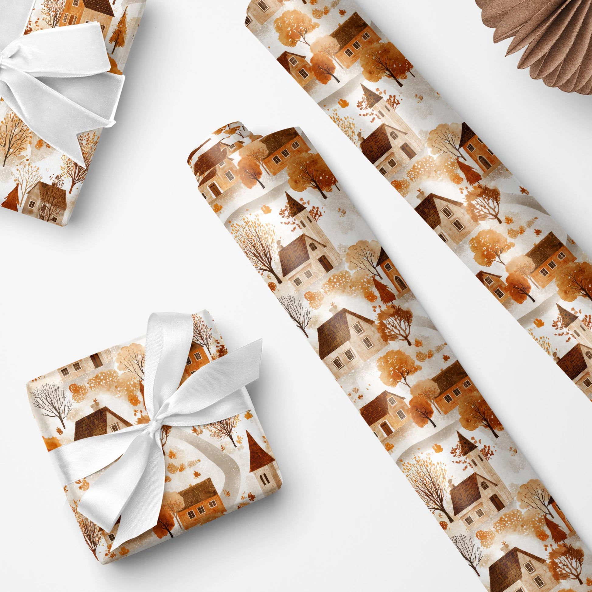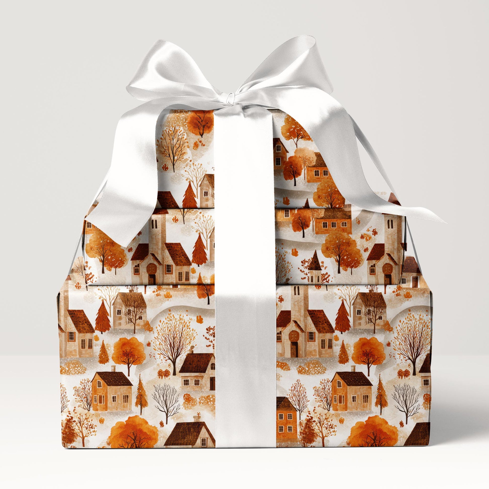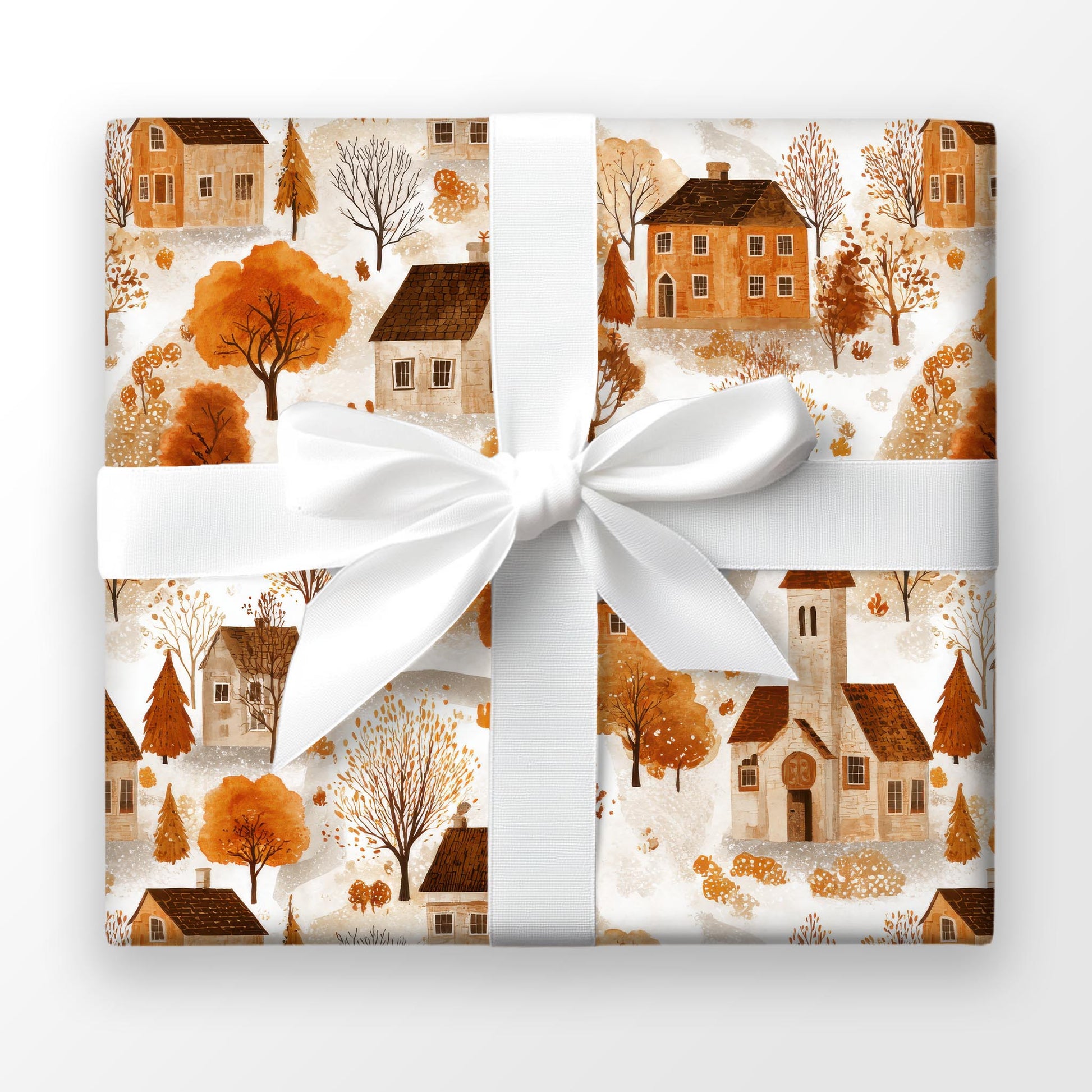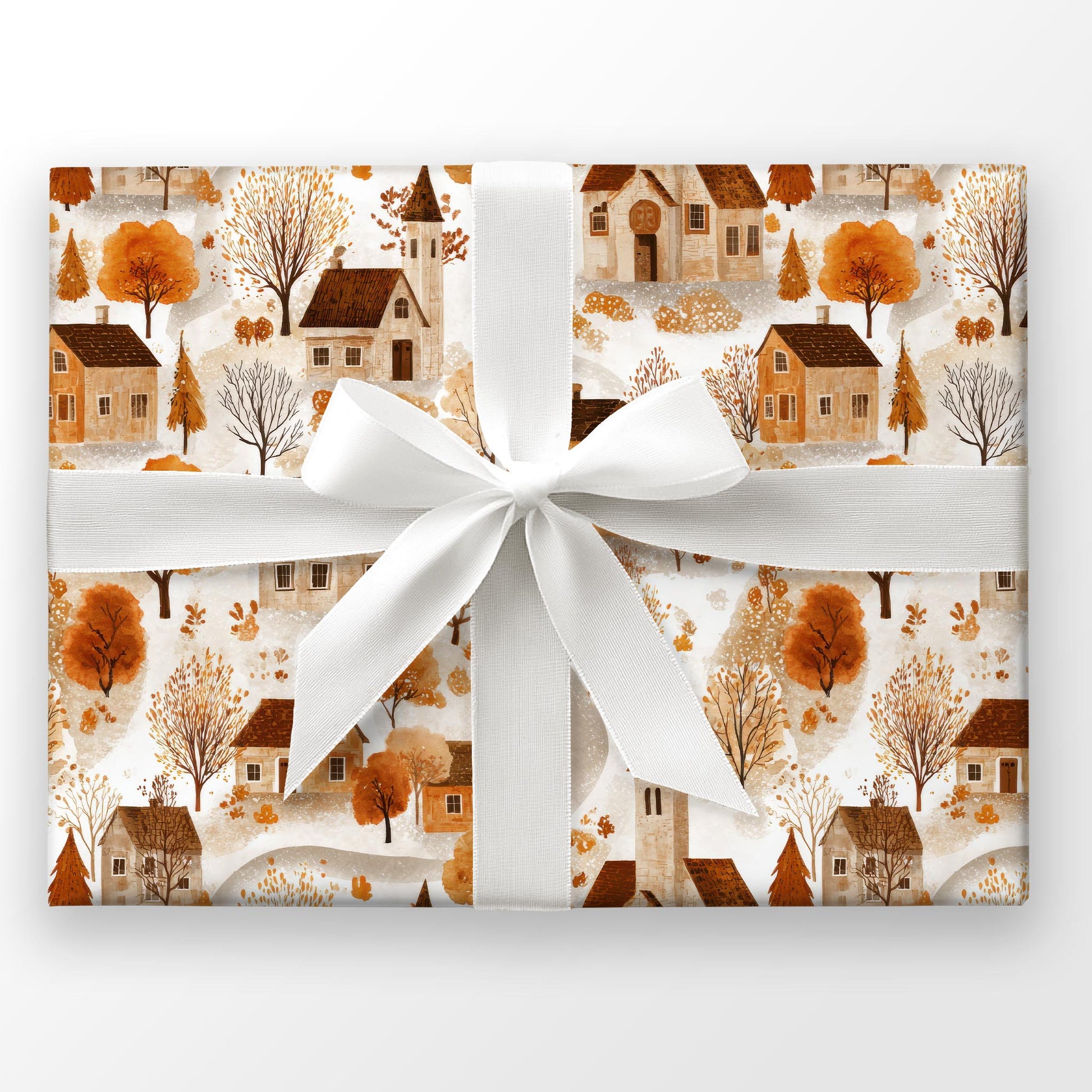 Step into the village — cozy cottages, barns, and autumn trees in rustic toile style.