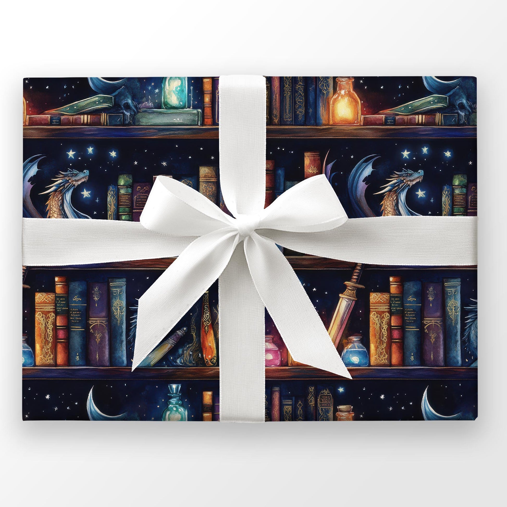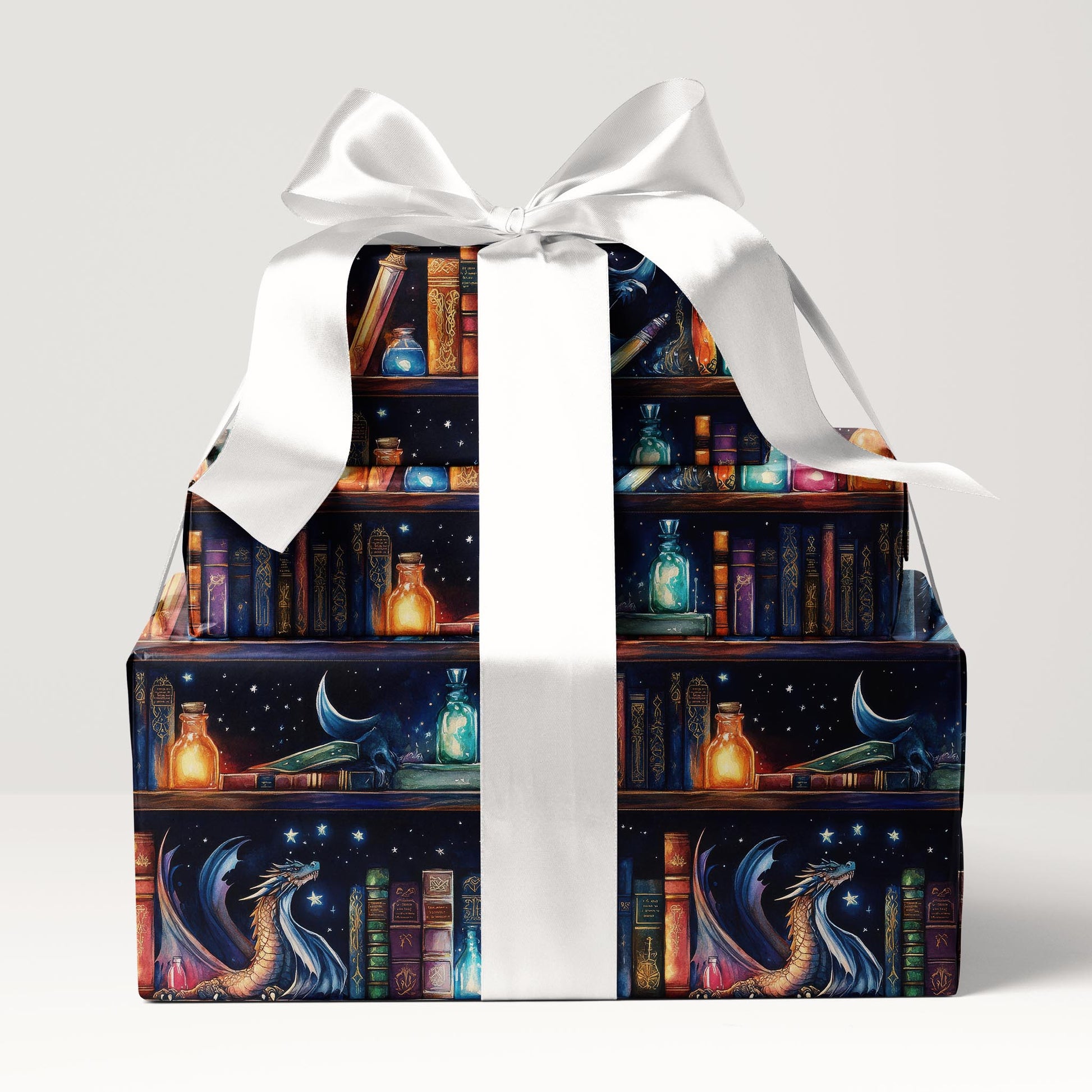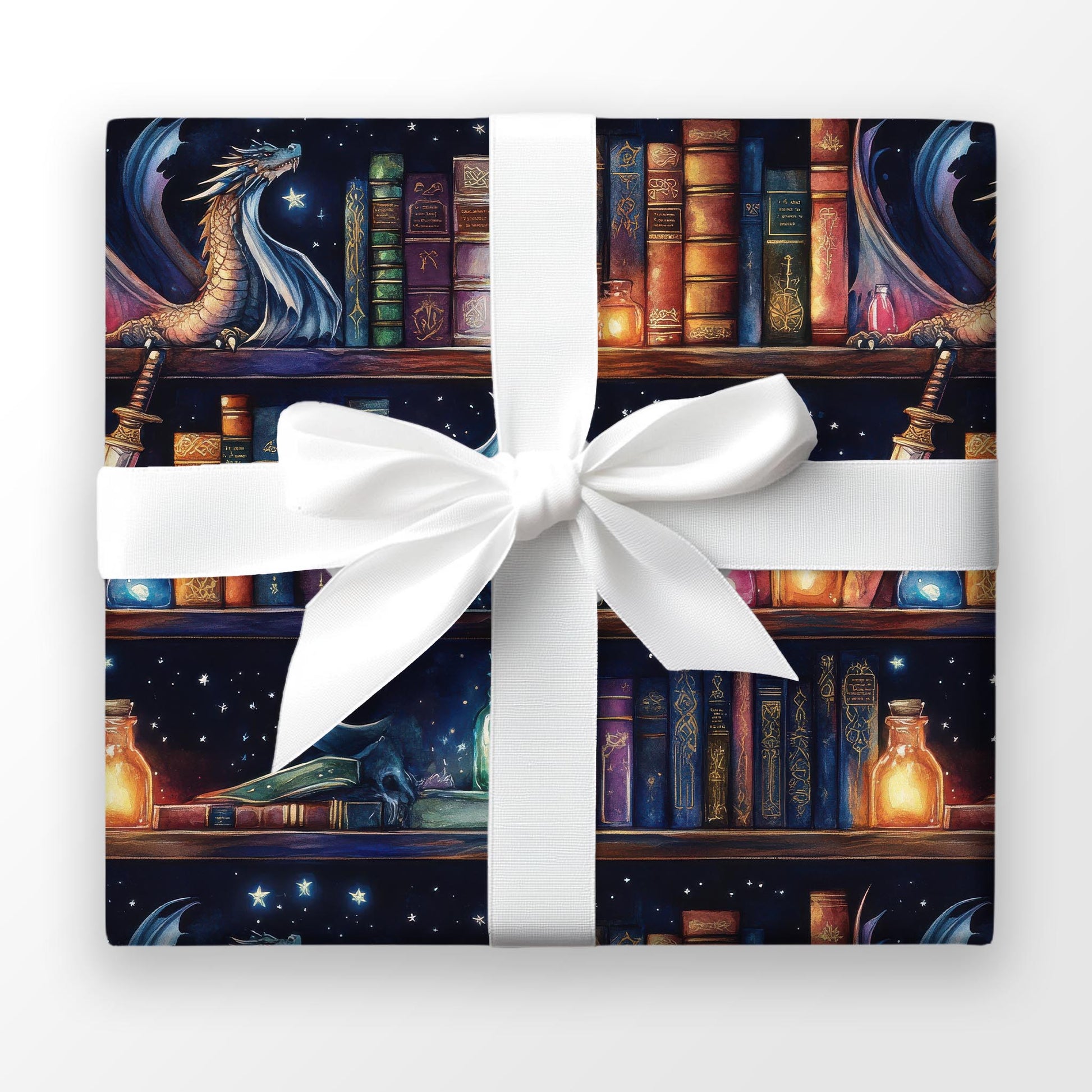 Fantasy shelves glow with potions, dragon statues, and enchanted tomes. Dragon’s Keep is a magical wrap for fantasy fans, adventurous readers, and imaginative celebrations.