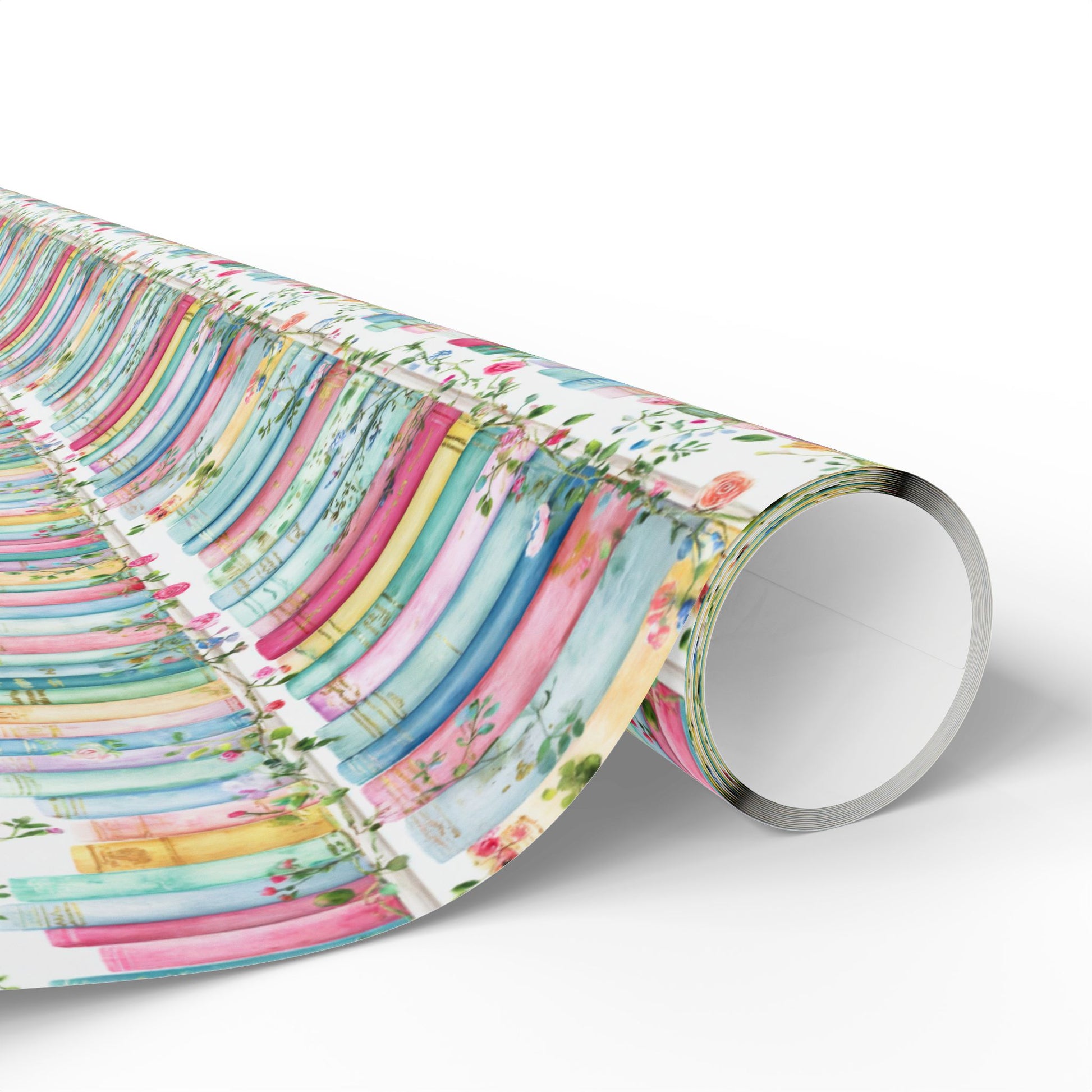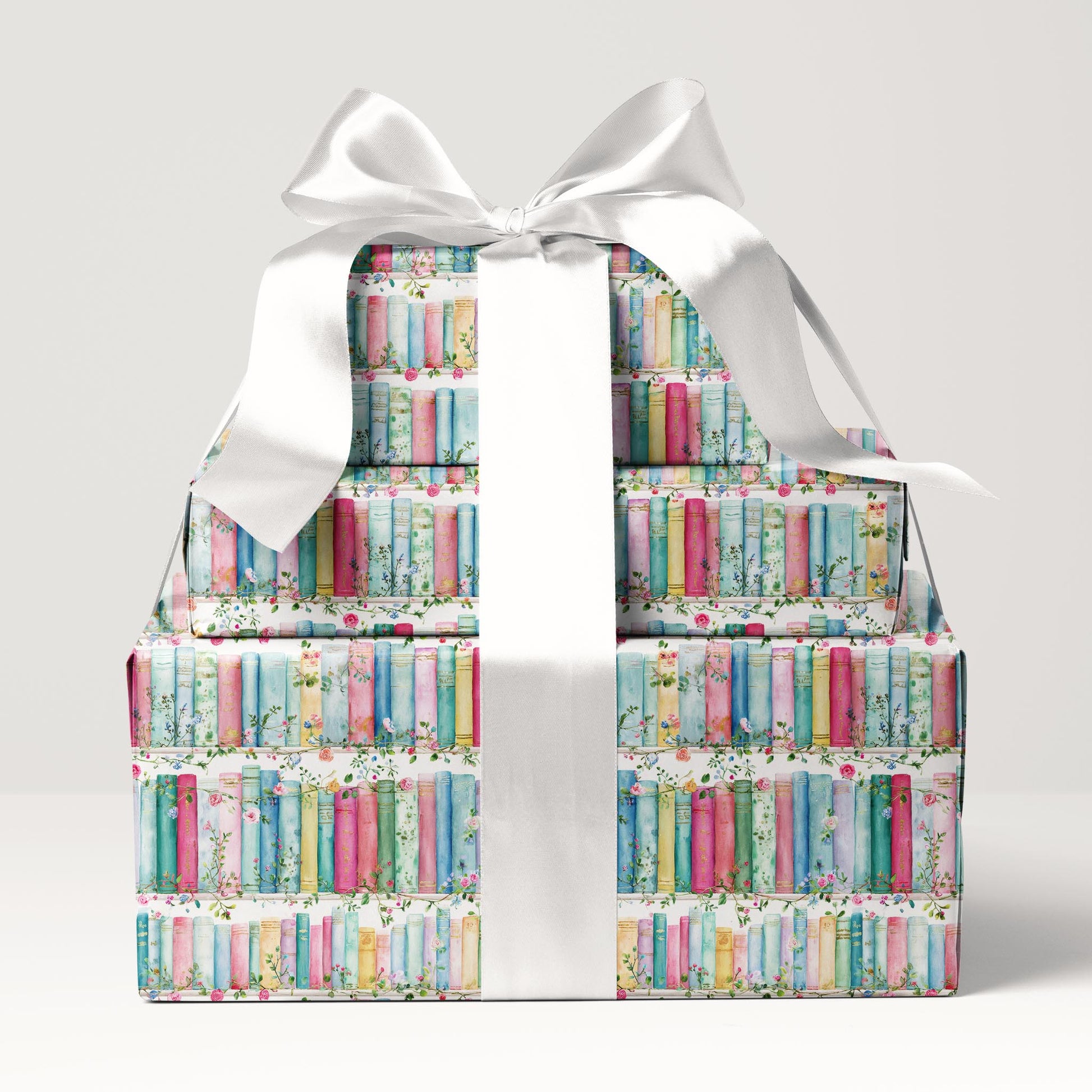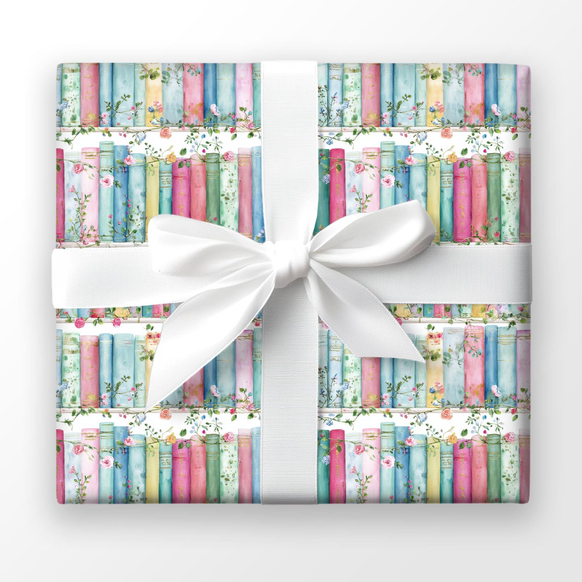 Rows of pastel book spines are accented with garlands of blossoms in this lighthearted design. Garden Shelf is a charming wrap for birthdays, book clubs, and gifts for readers who love florals.