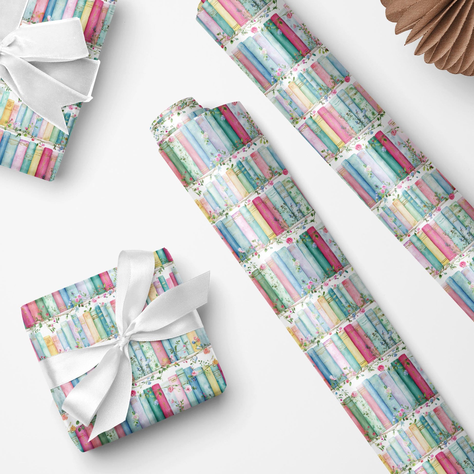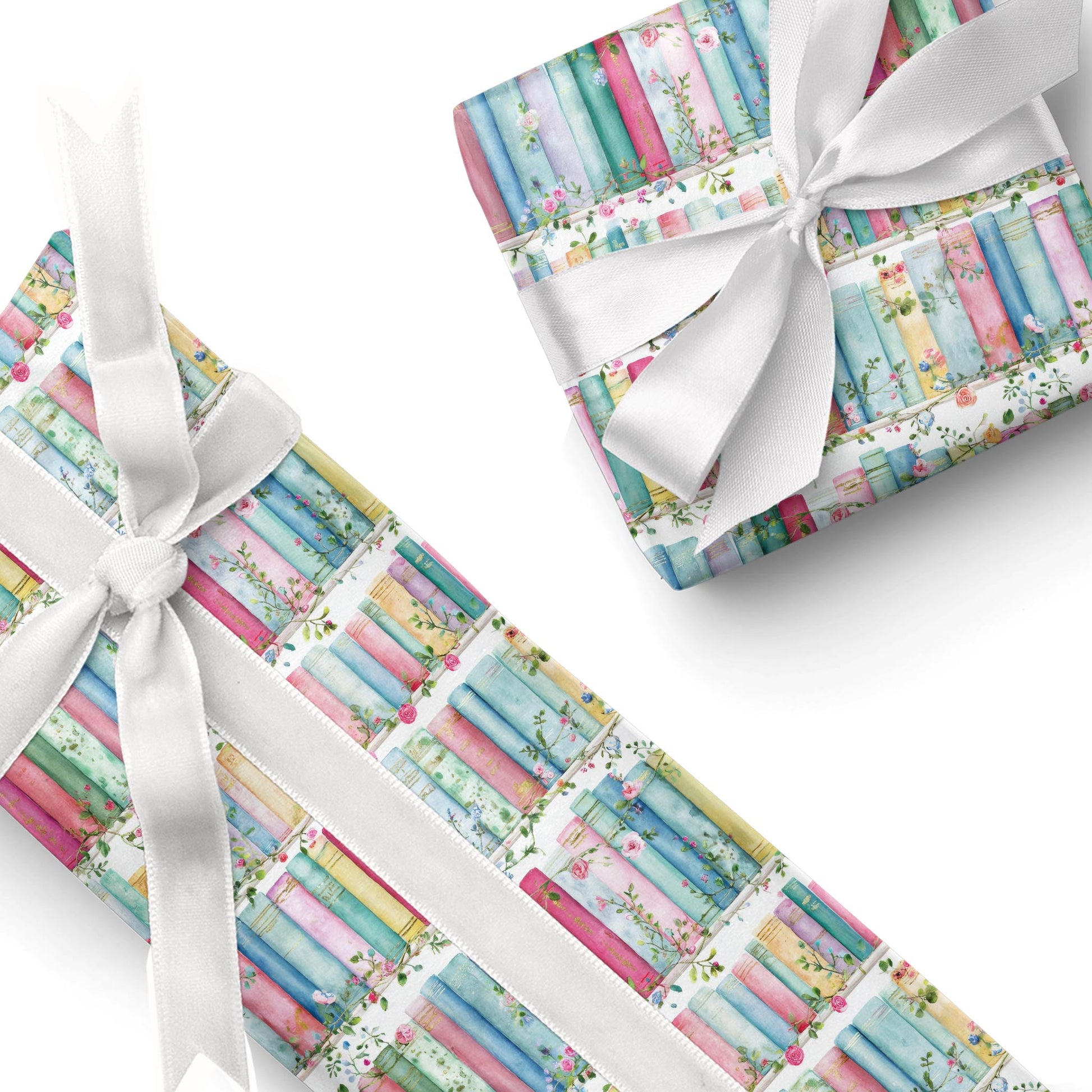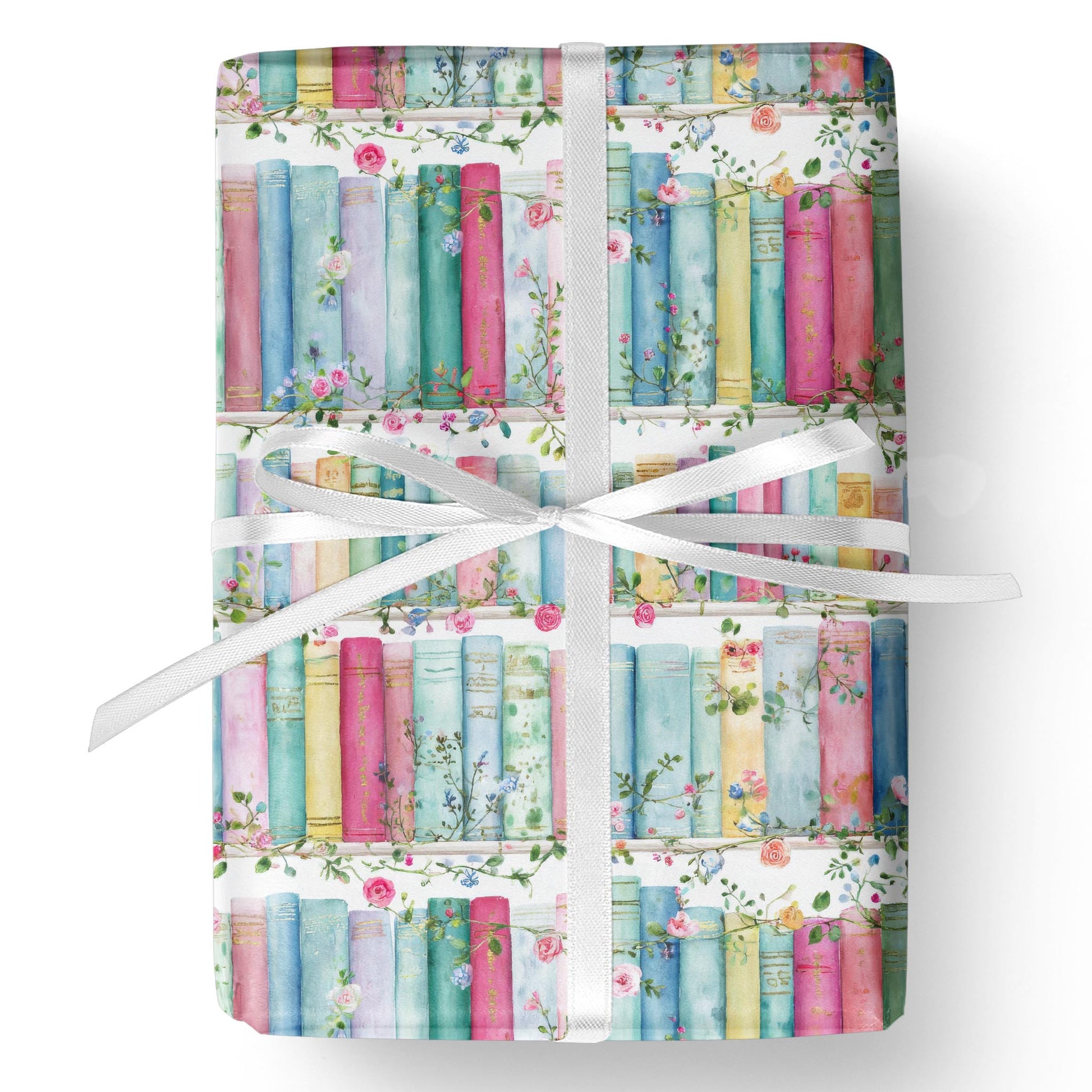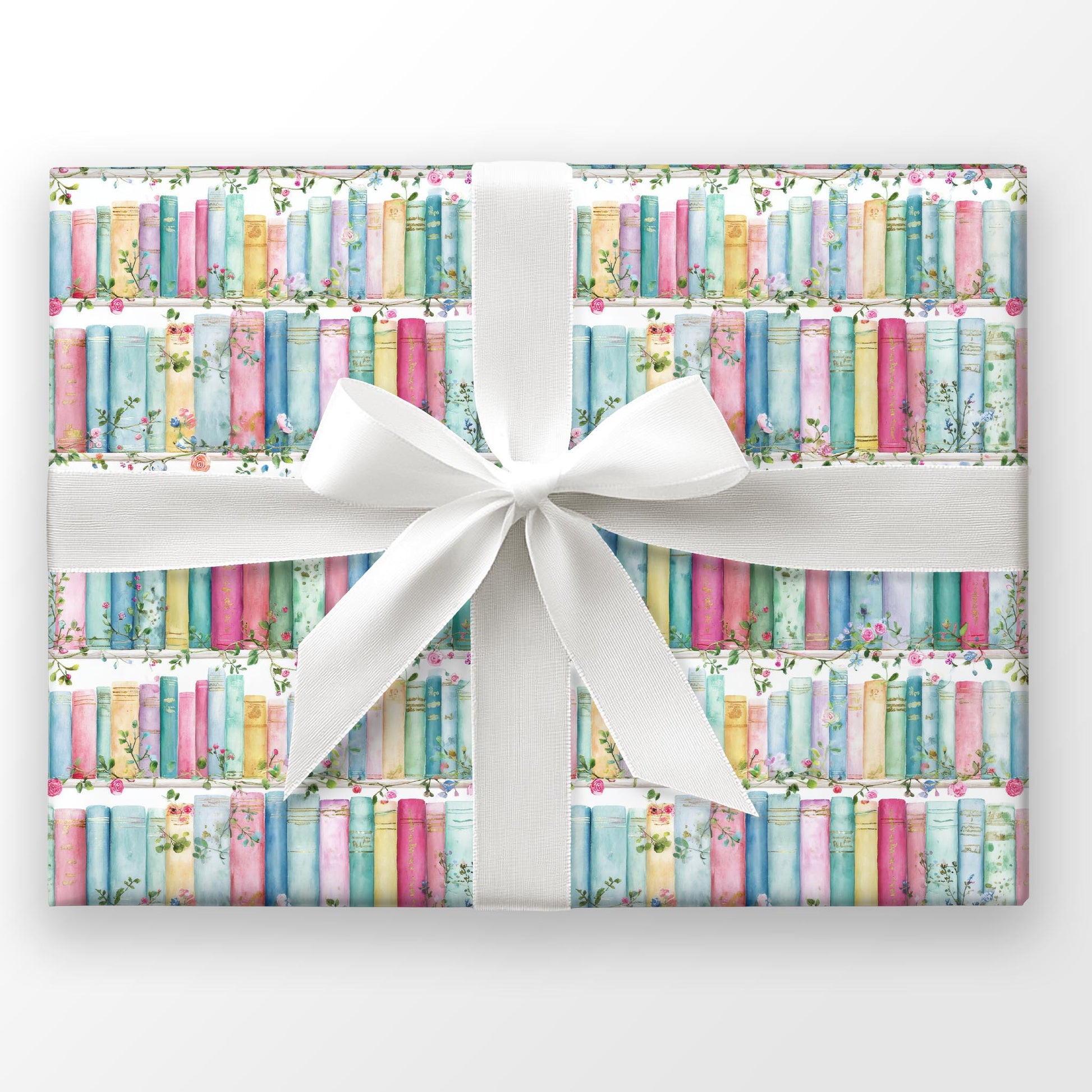 Rows of pastel book spines are accented with garlands of blossoms in this lighthearted design. Garden Shelf is a charming wrap for birthdays, book clubs, and gifts for readers who love florals.