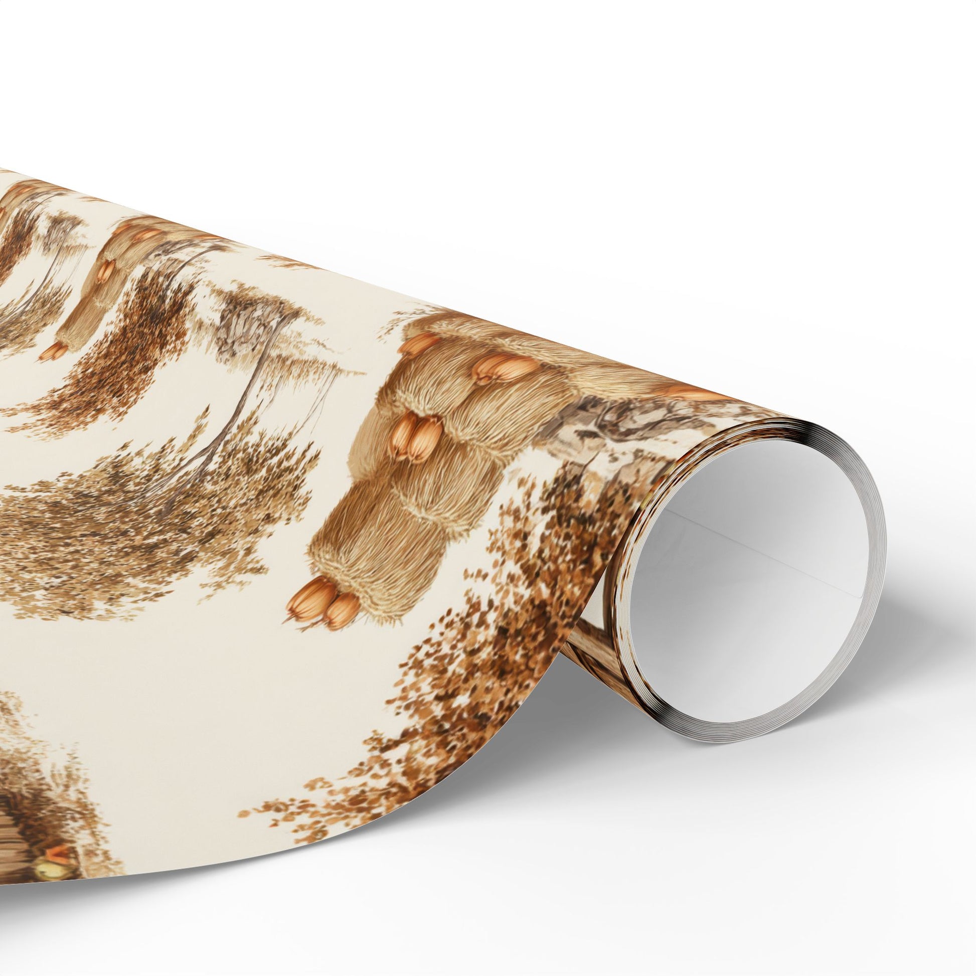 Rustic hay bales, barns, and autumn trees in warm sepia toile.