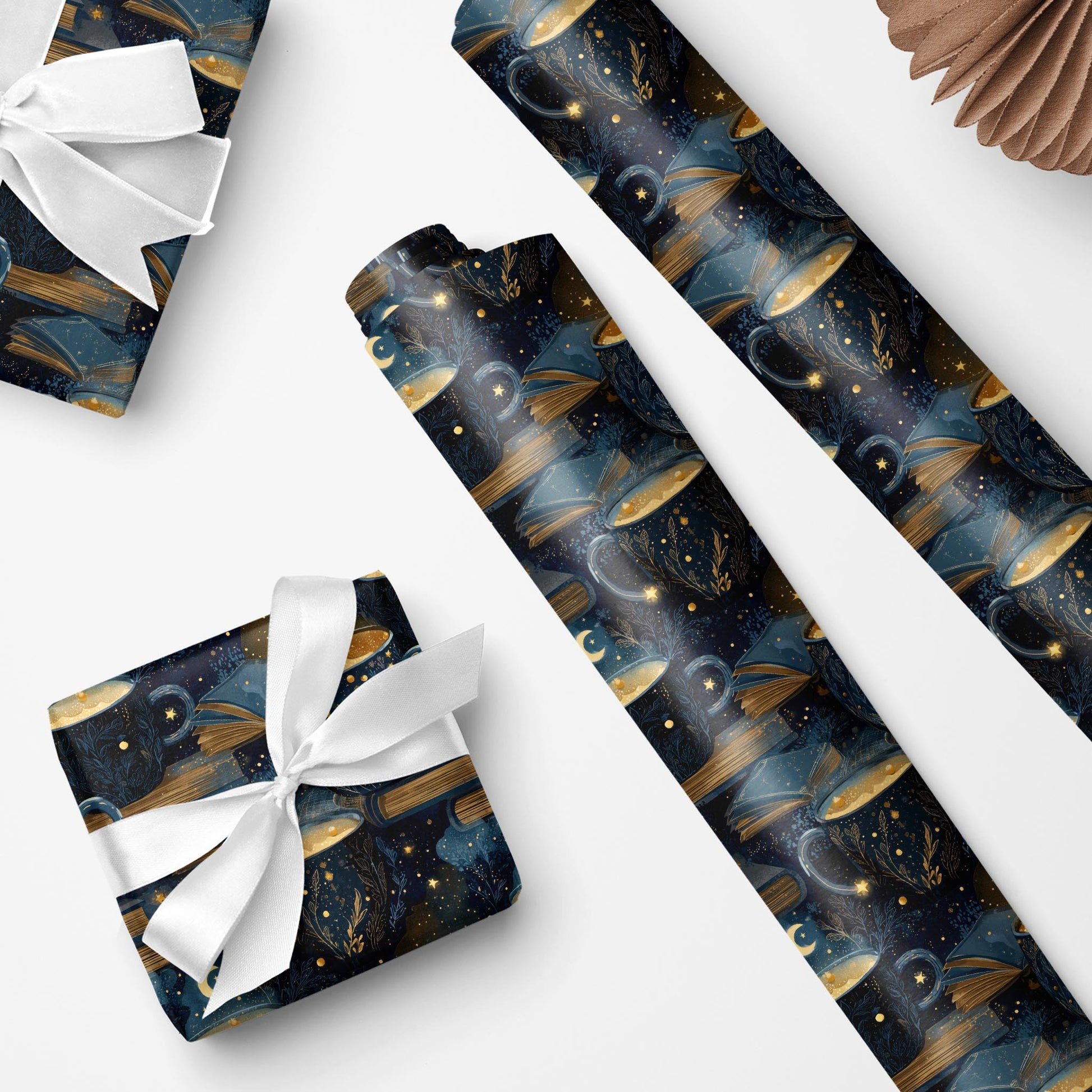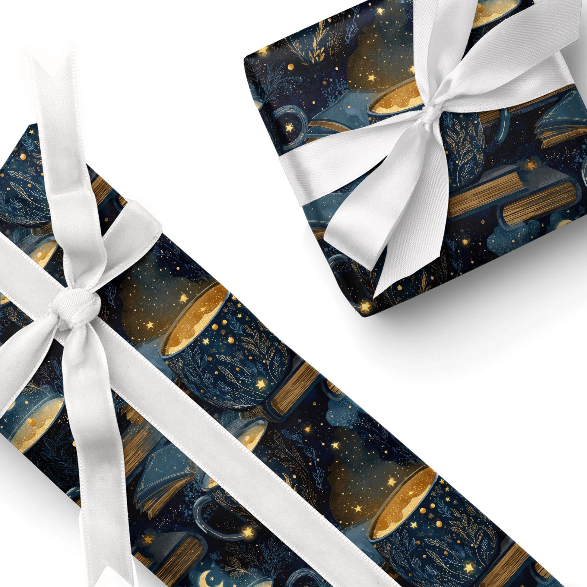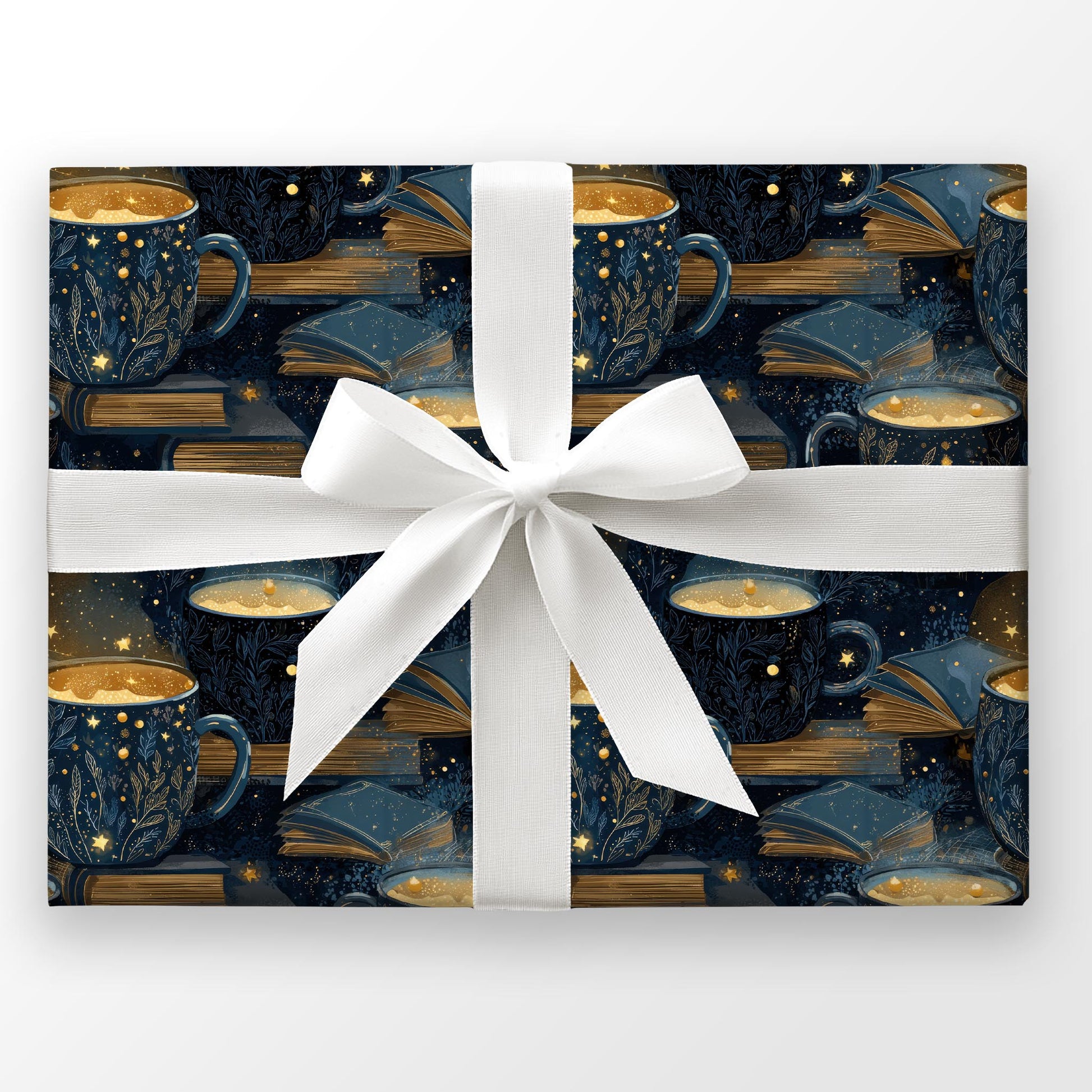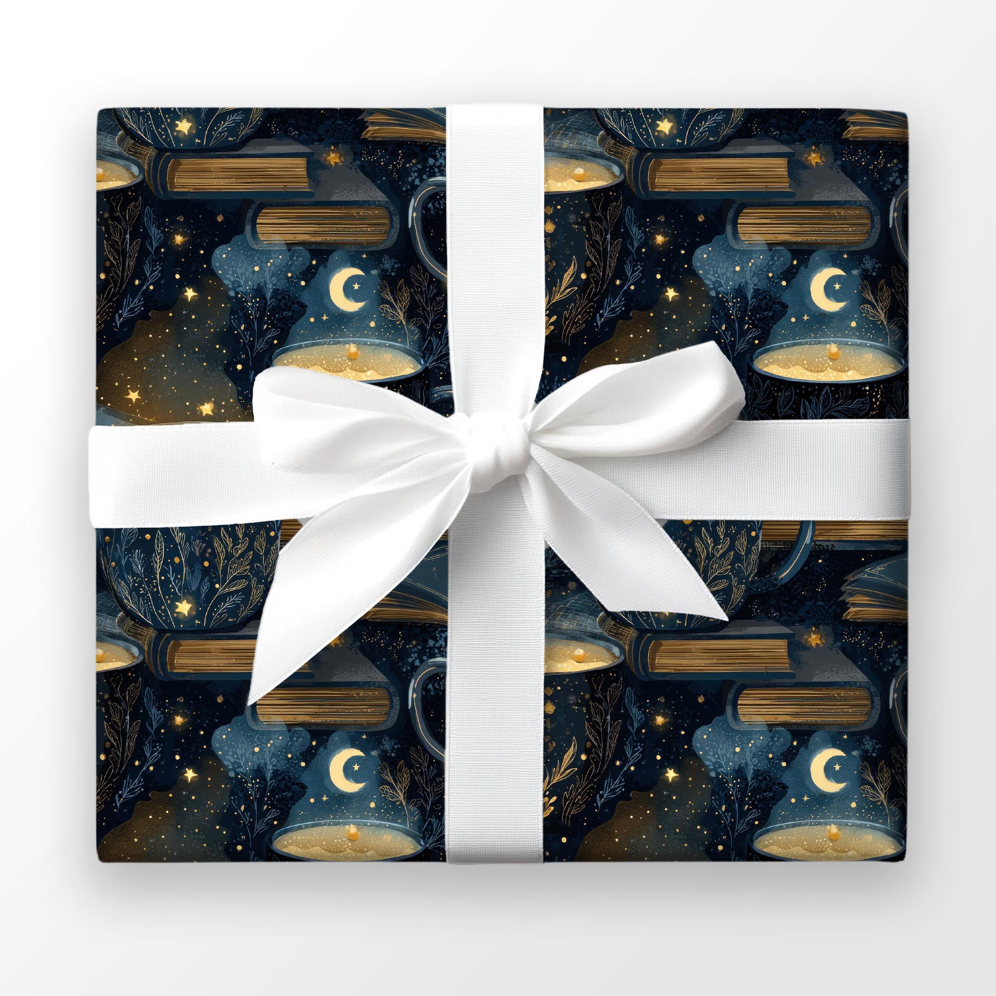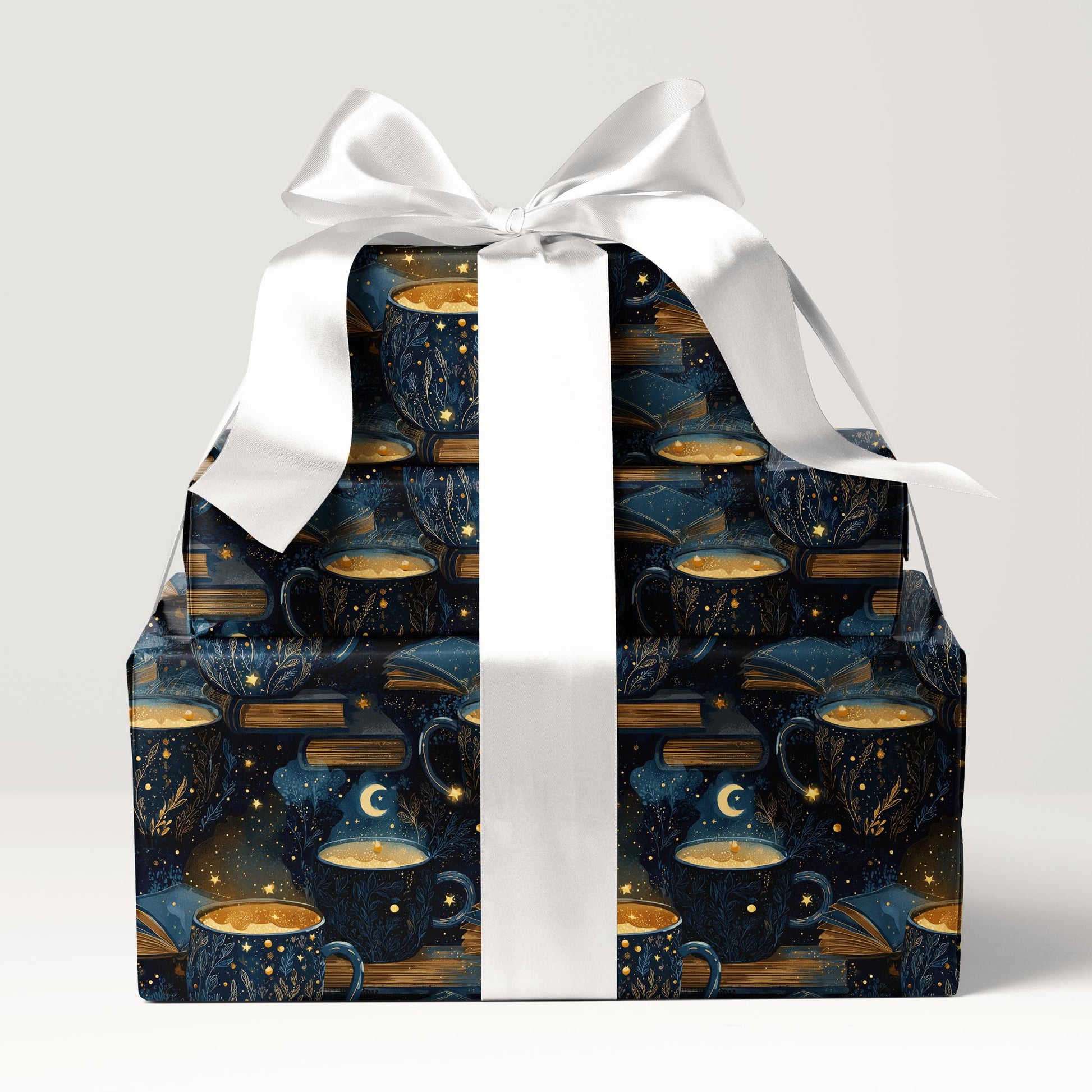 Mugs glow with golden moons and starlight in this cosmic watercolor repeat. Moonlit Brews is a celestial wrap for tea drinkers, fantasy readers, and dreamy occasions.