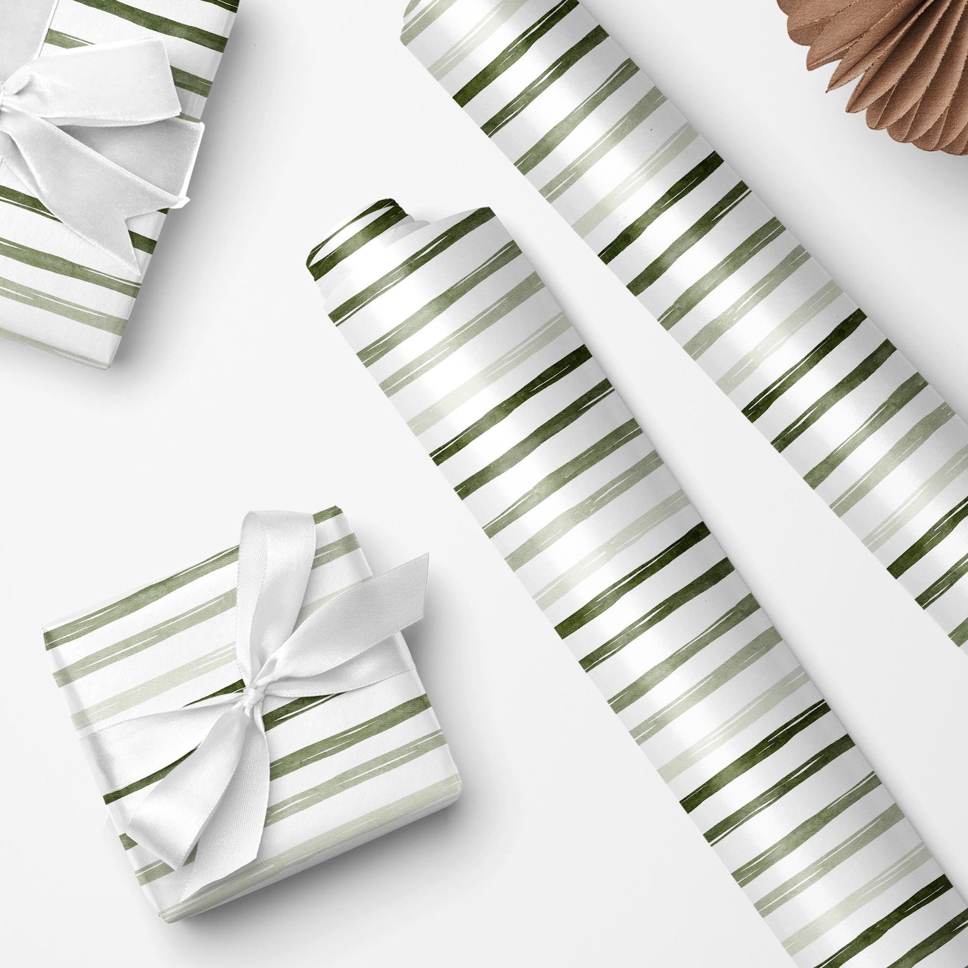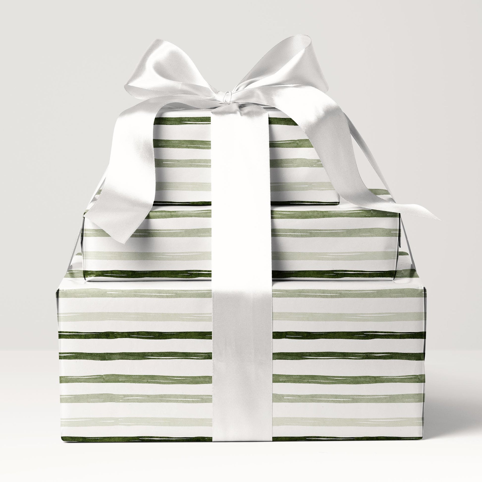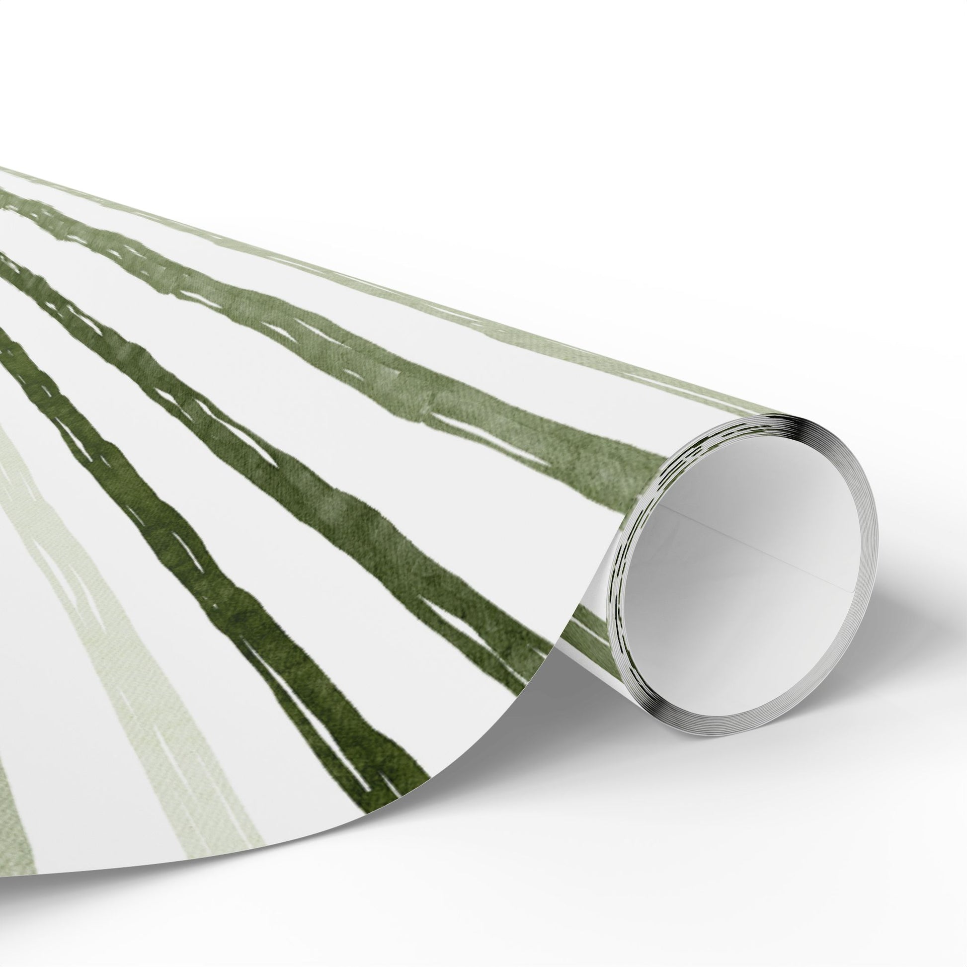 Sage and hunter green watercolor stripes drift across white in Overland Stripe — a clean, outdoorsy wrap perfect for Father’s Day, Christmas, or rugged year-round gifting.