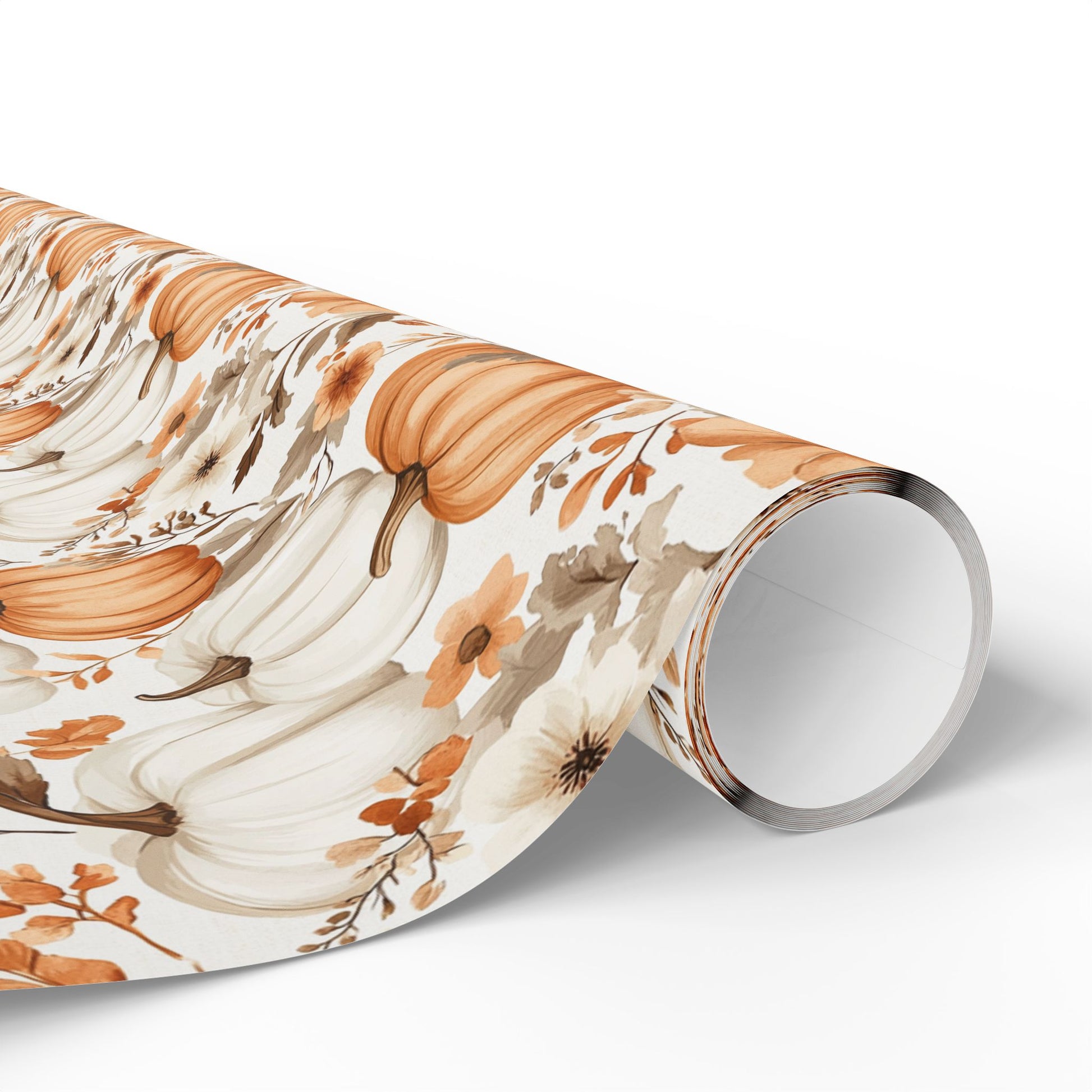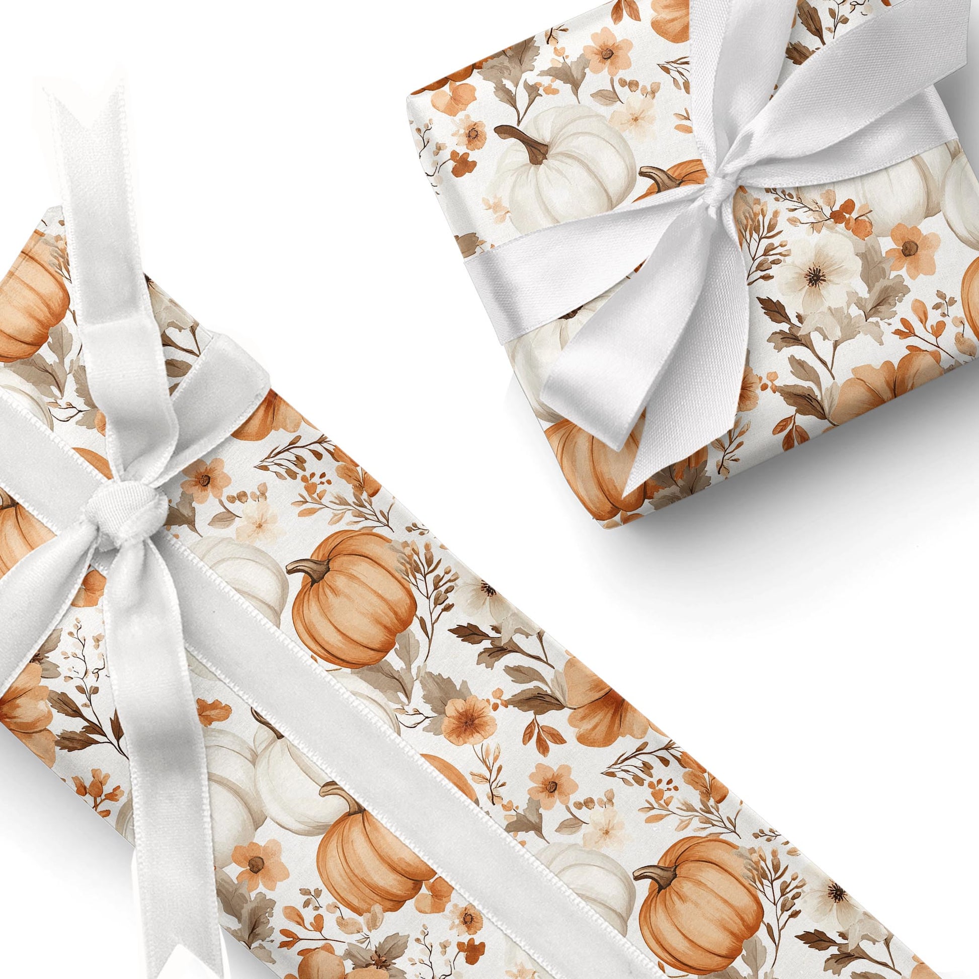 This floral-meets-harvest design blends ivory blooms with cream and orange pumpkins in a warm, romantic palette.