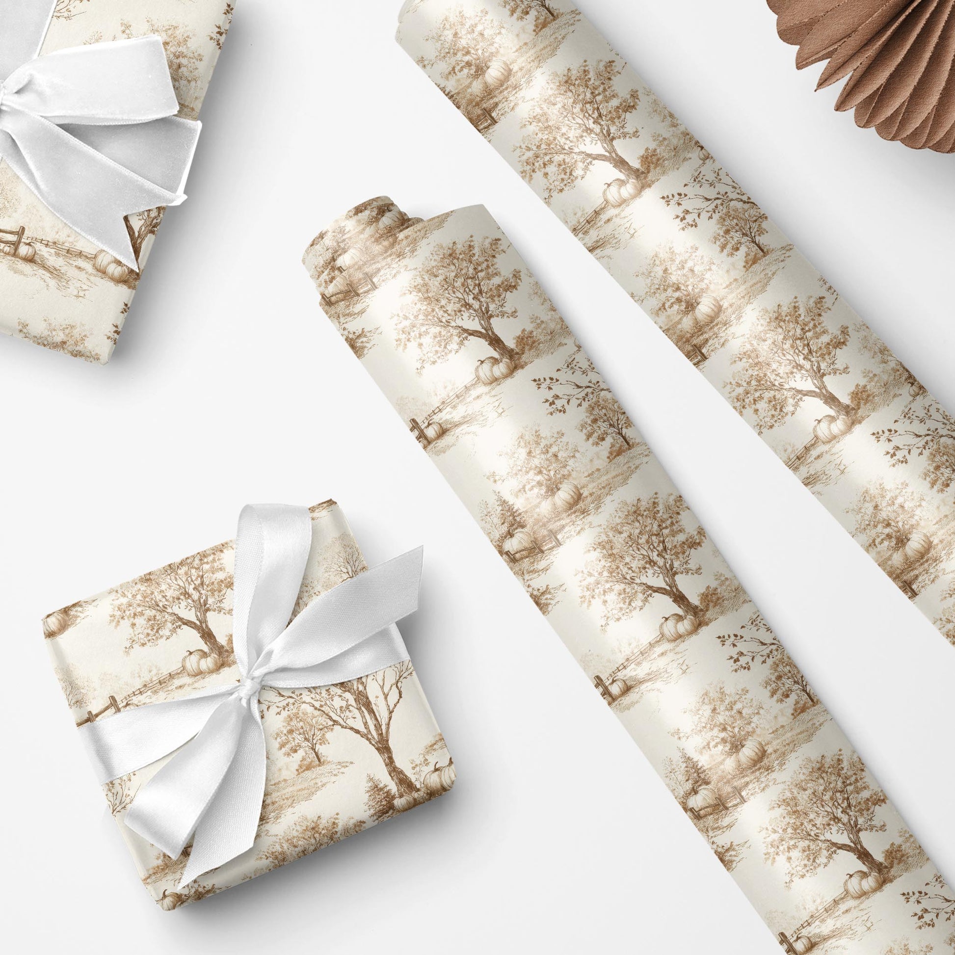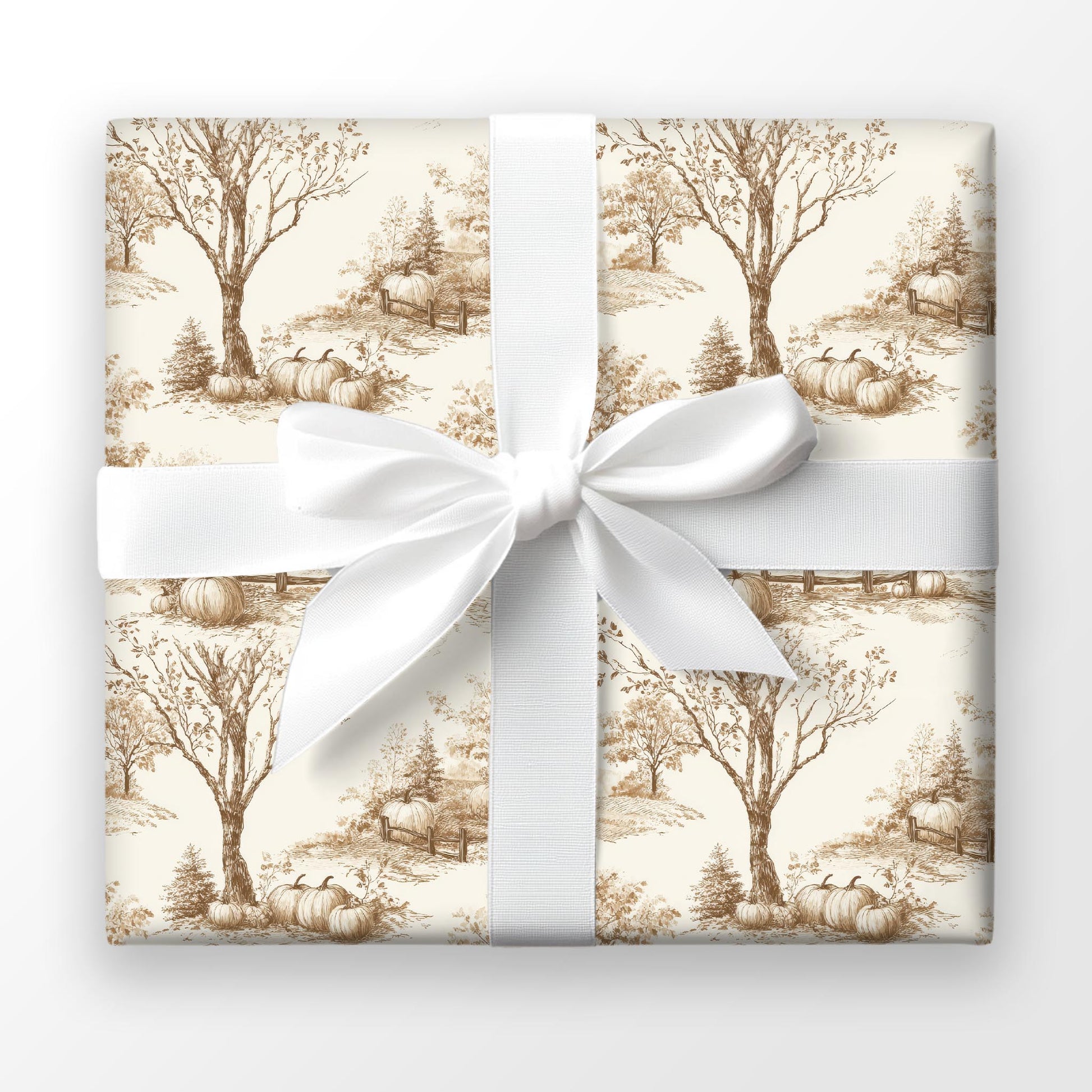 Pumpkins, fences, and autumn trees sketch a pastoral toile scene.
