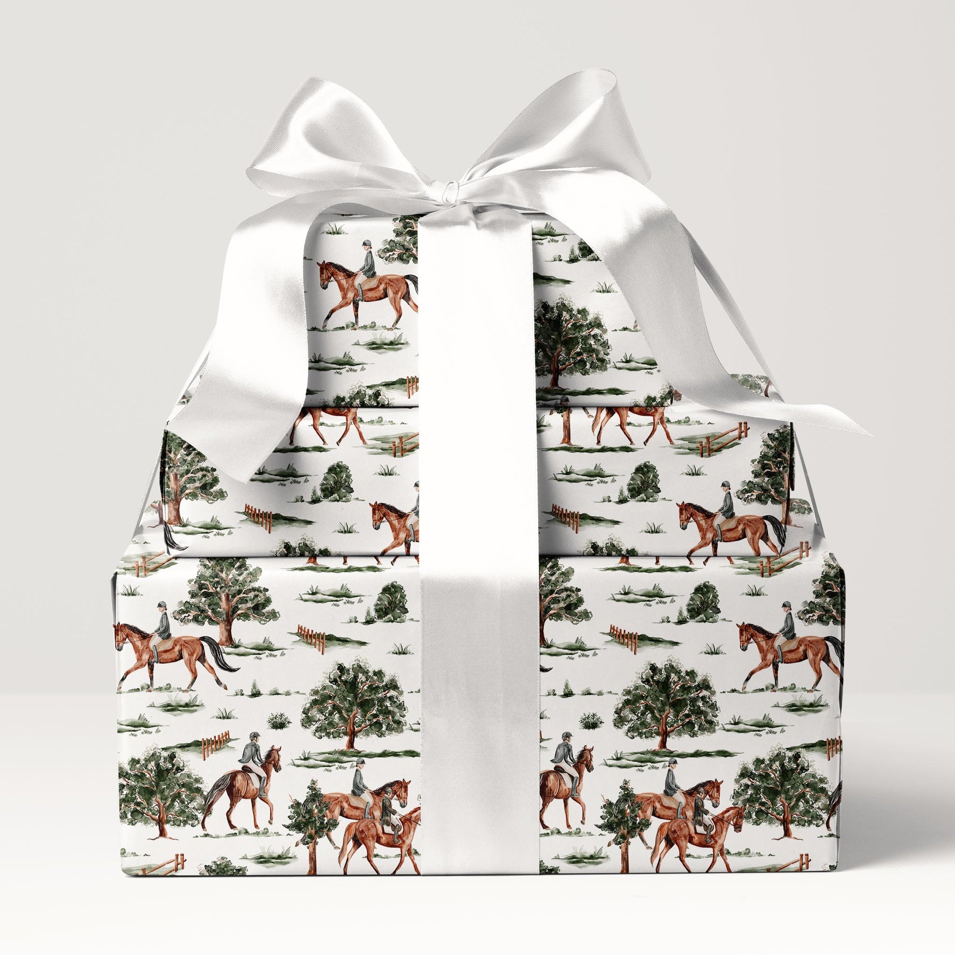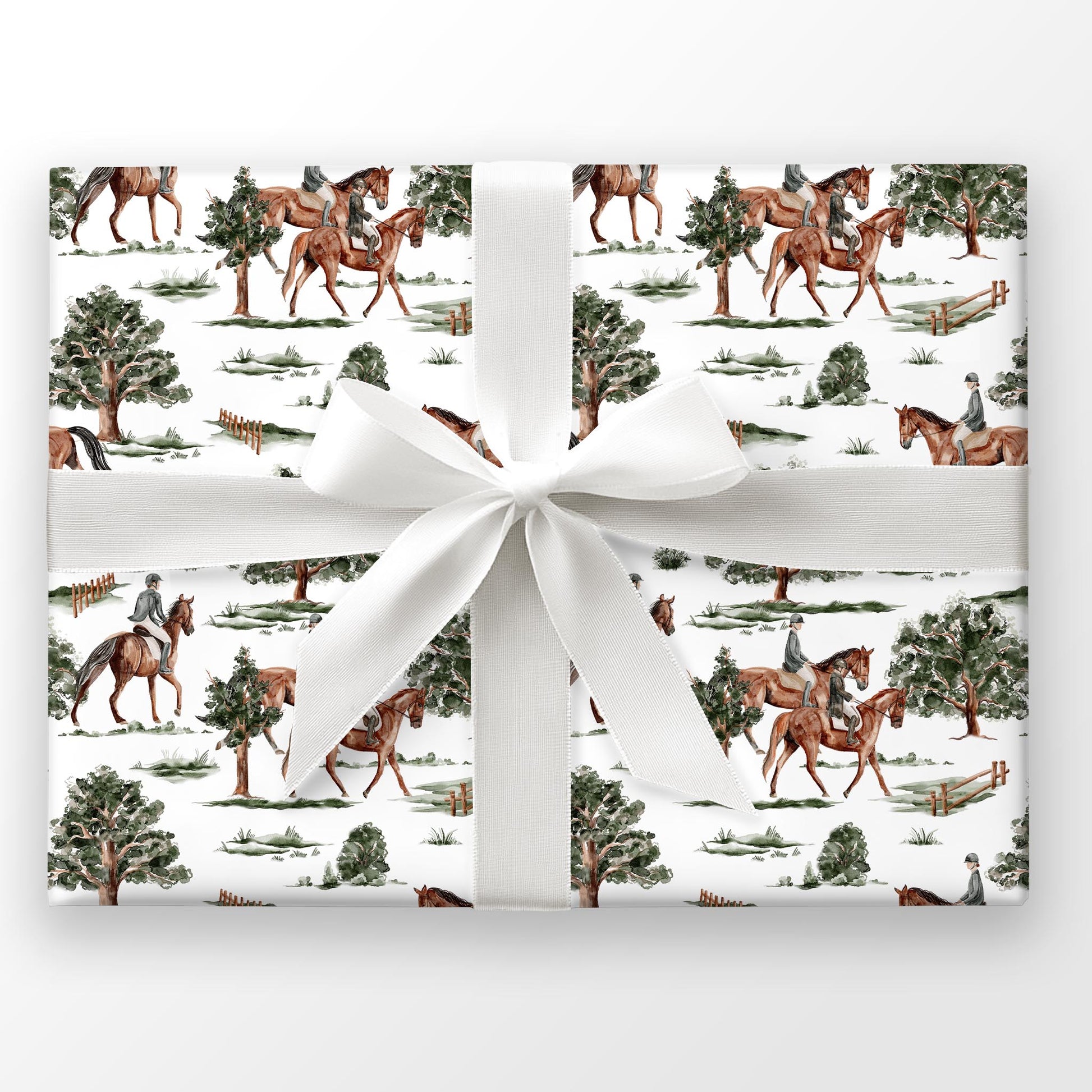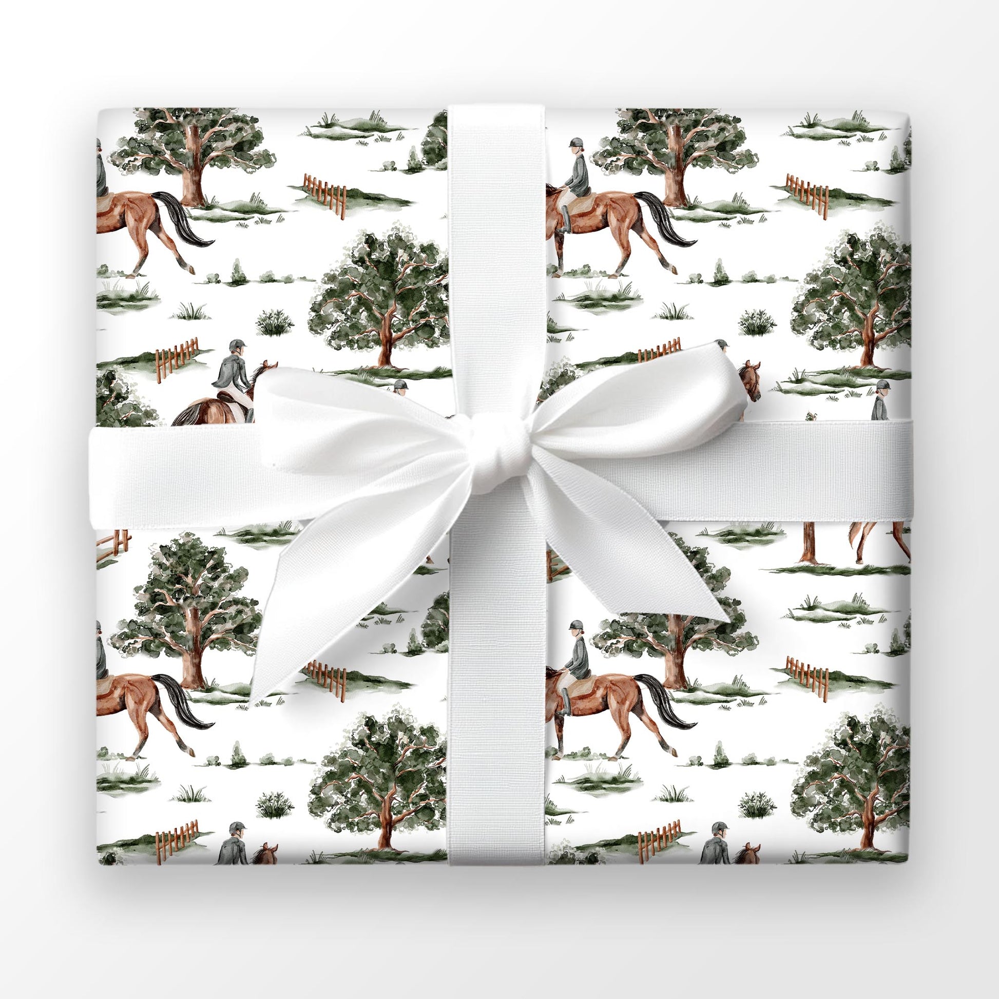 Horses and riders in classic gear trot through green trees on crisp white. Rider’s Hollow is a playful, vintage-inspired wrap — perfect for Father’s Day, Christmas, or woodland-themed gifting.