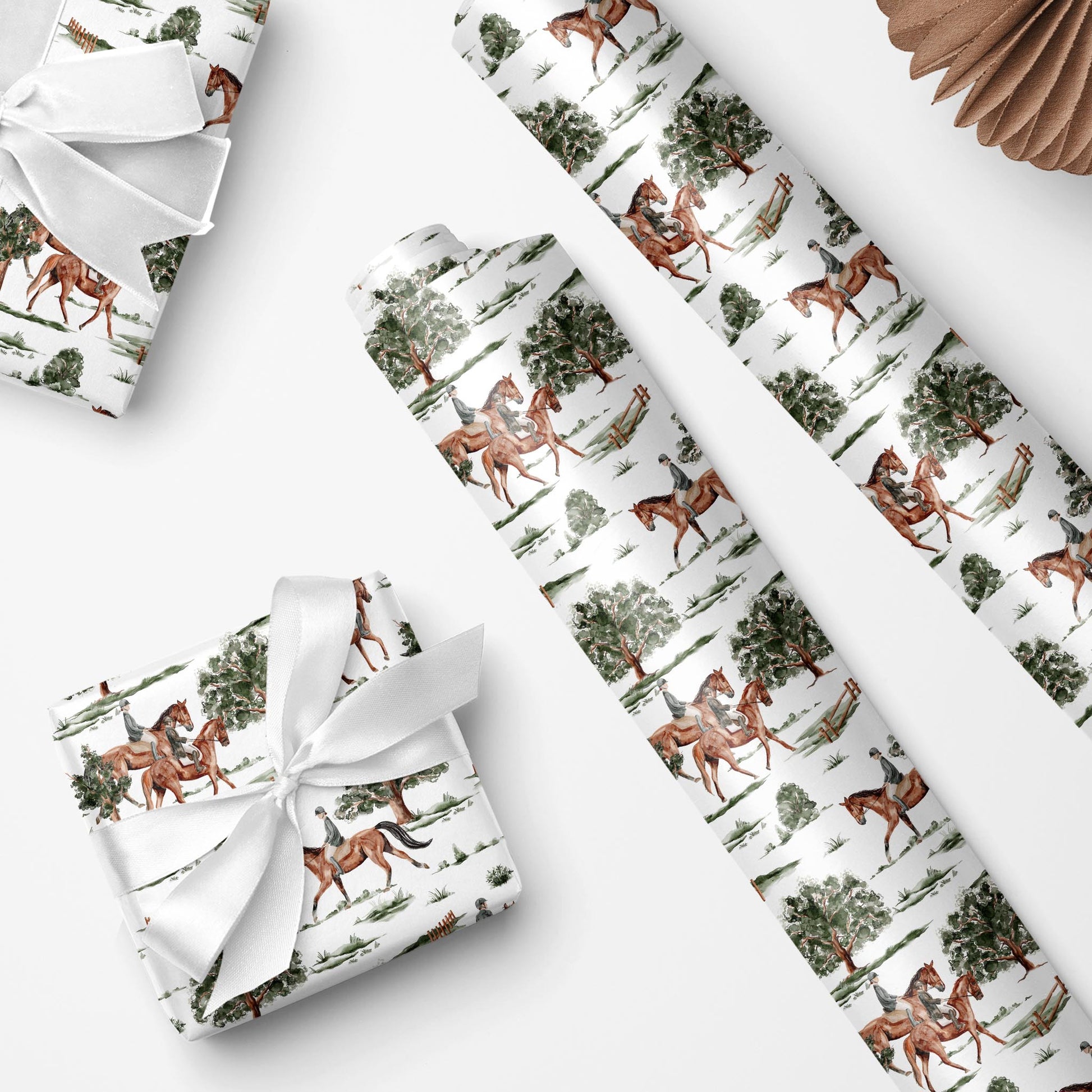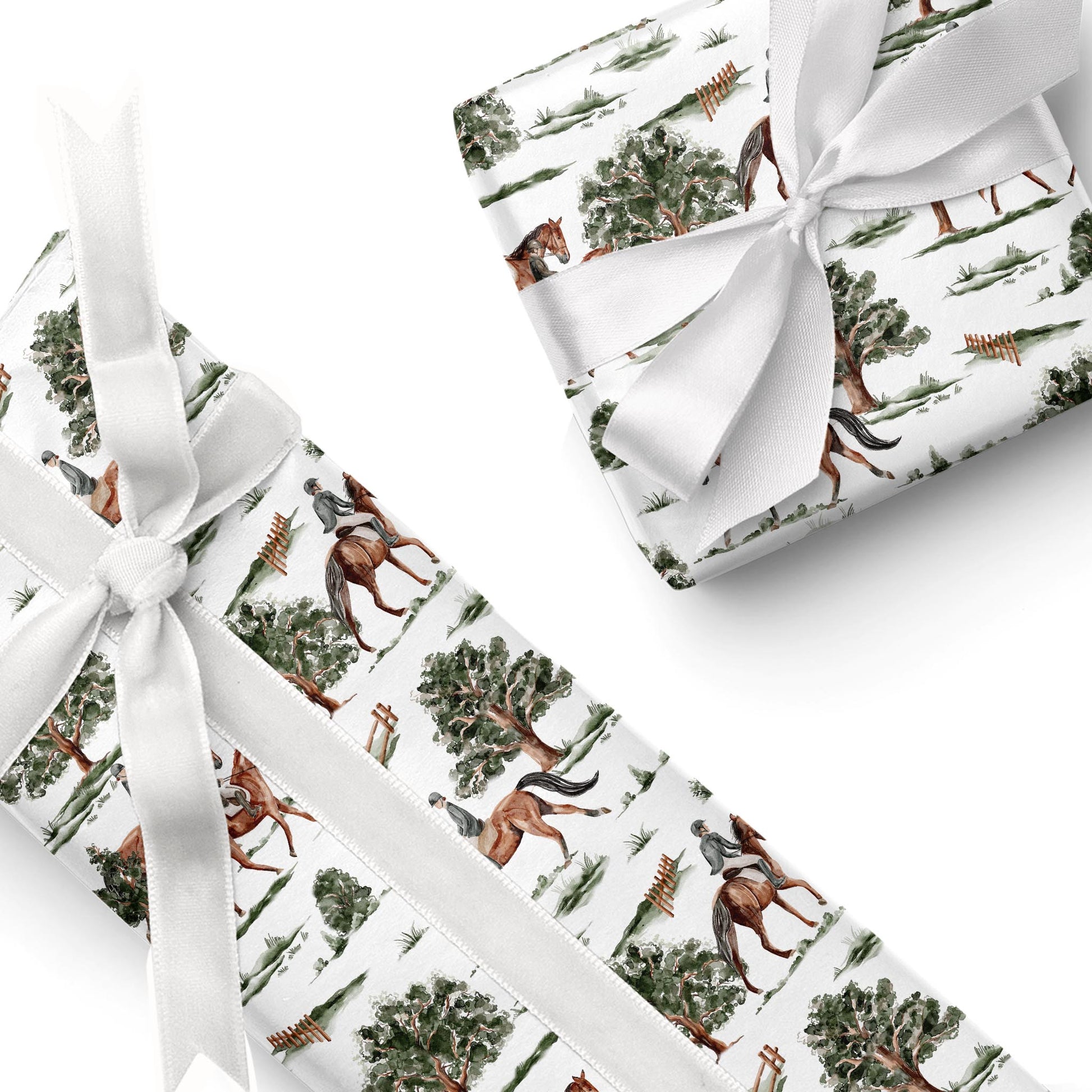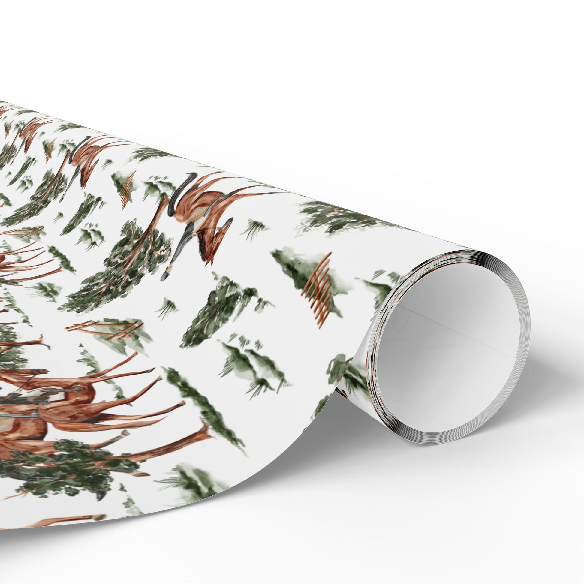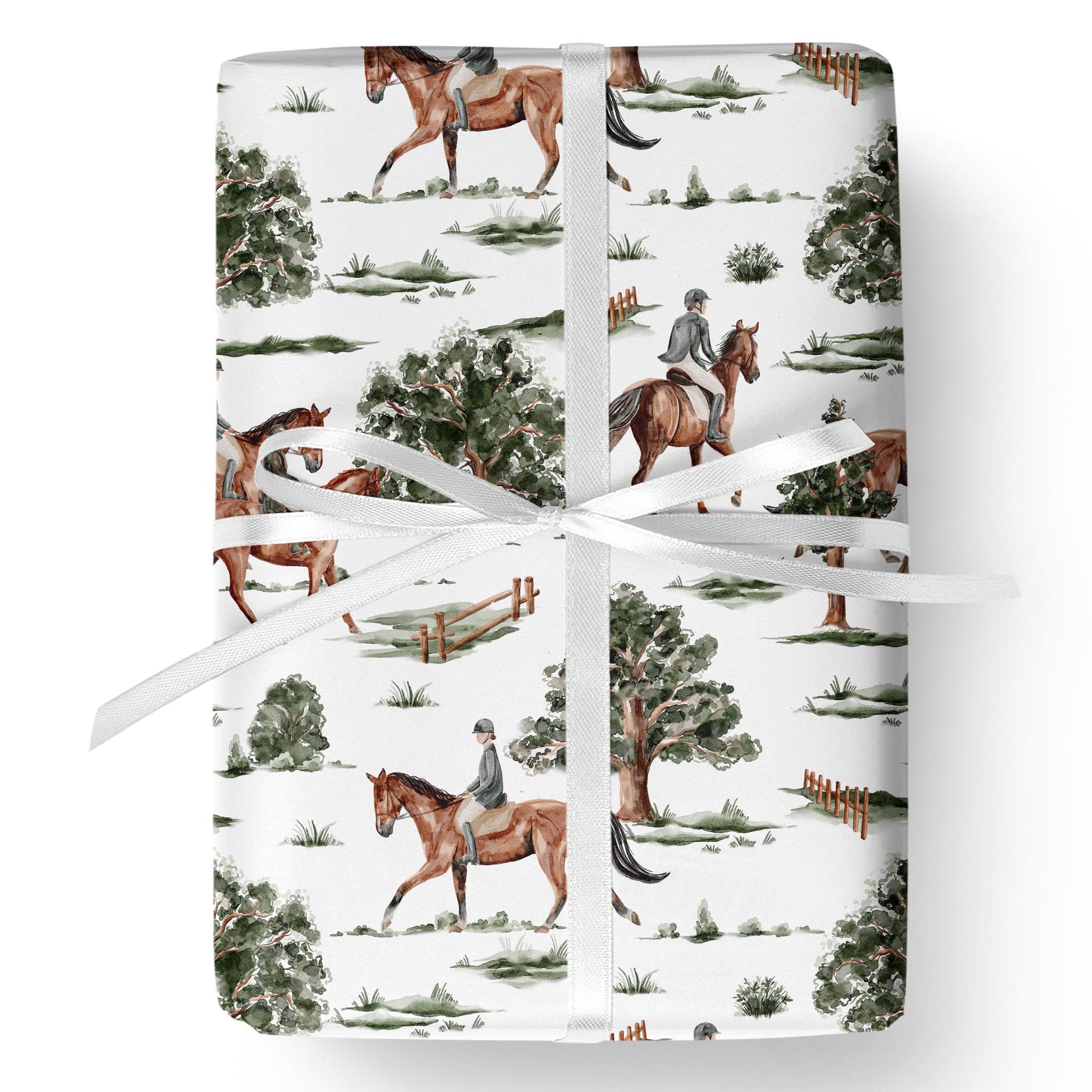 Horses and riders in classic gear trot through green trees on crisp white. Rider’s Hollow is a playful, vintage-inspired wrap — perfect for Father’s Day, Christmas, or woodland-themed gifting.