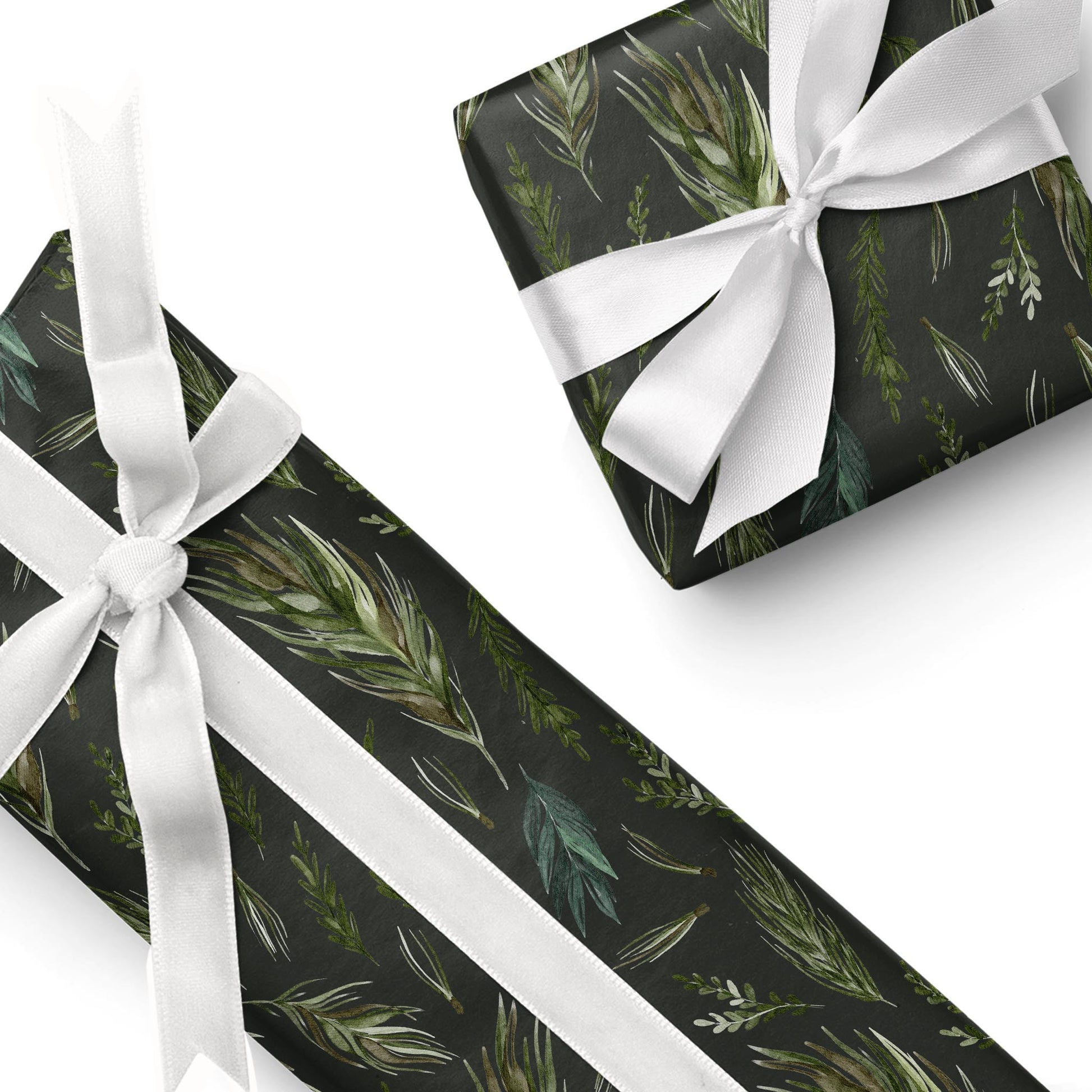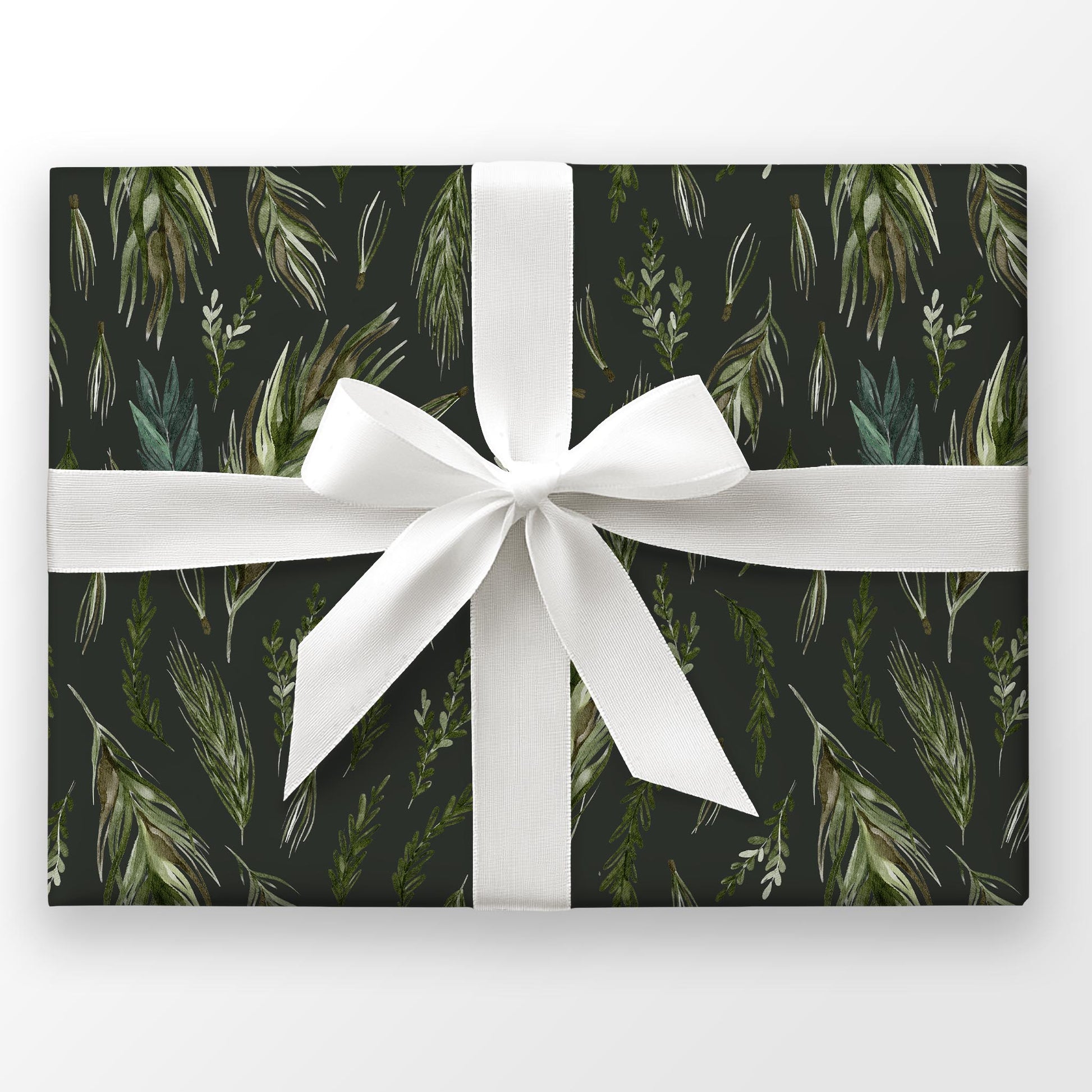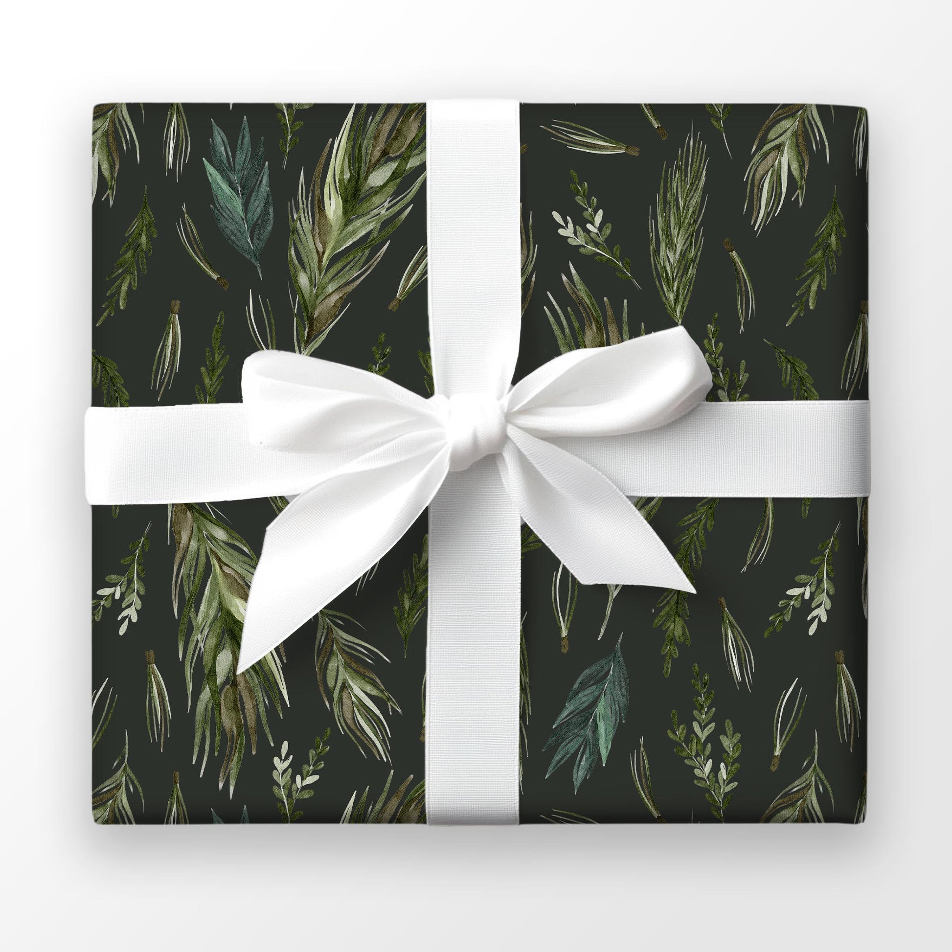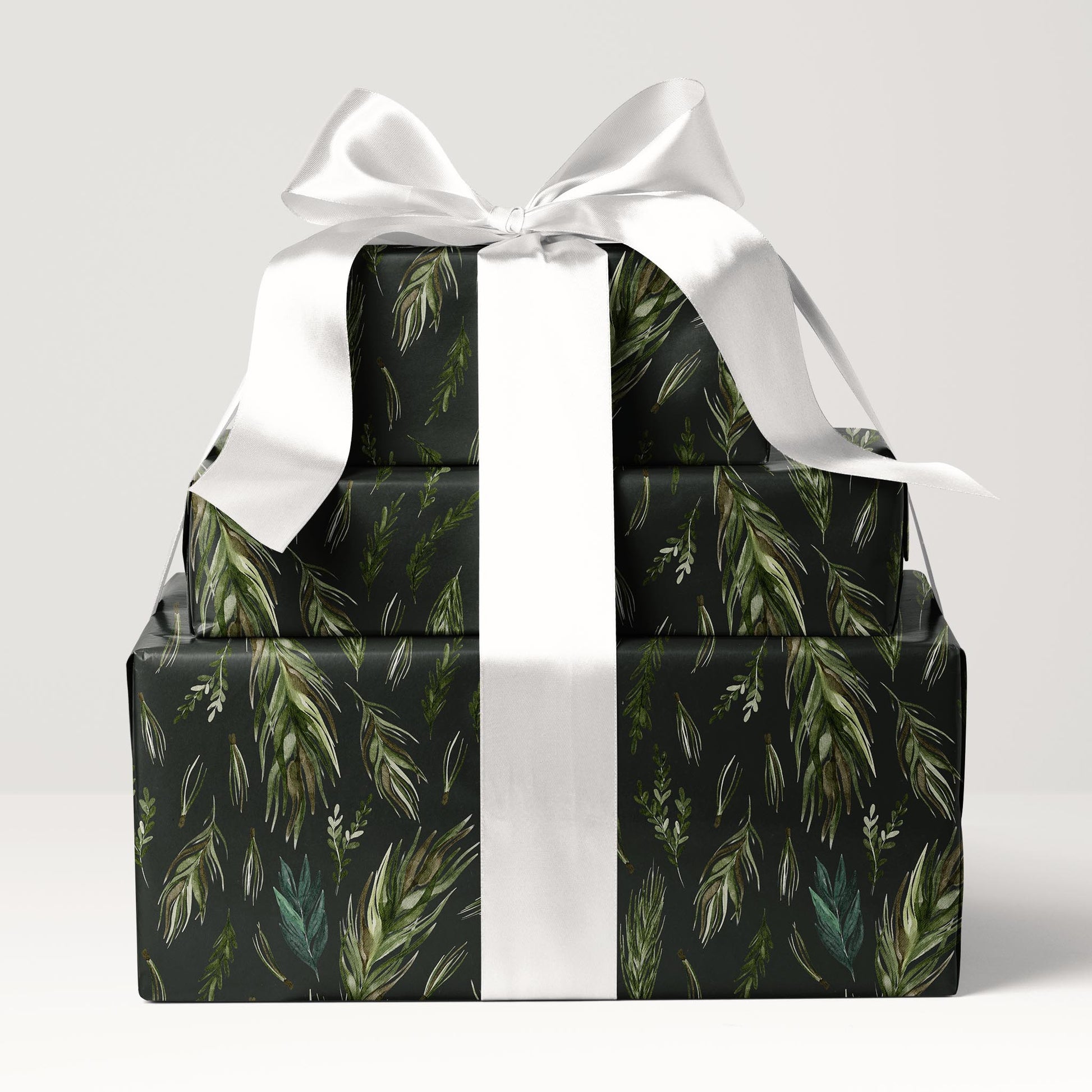 Dark pine sprigs stretch across a nearly black background in Shadowed Grove — a bold, masculine wrap with vintage woodland depth, perfect for Father’s Day or richly toned holiday gifting.