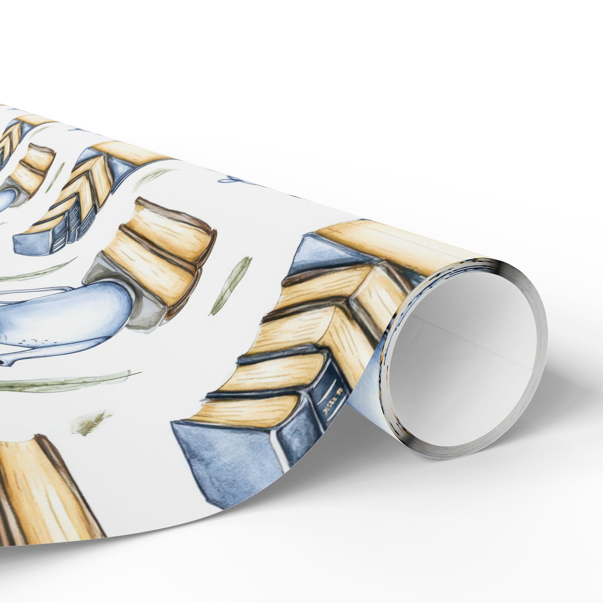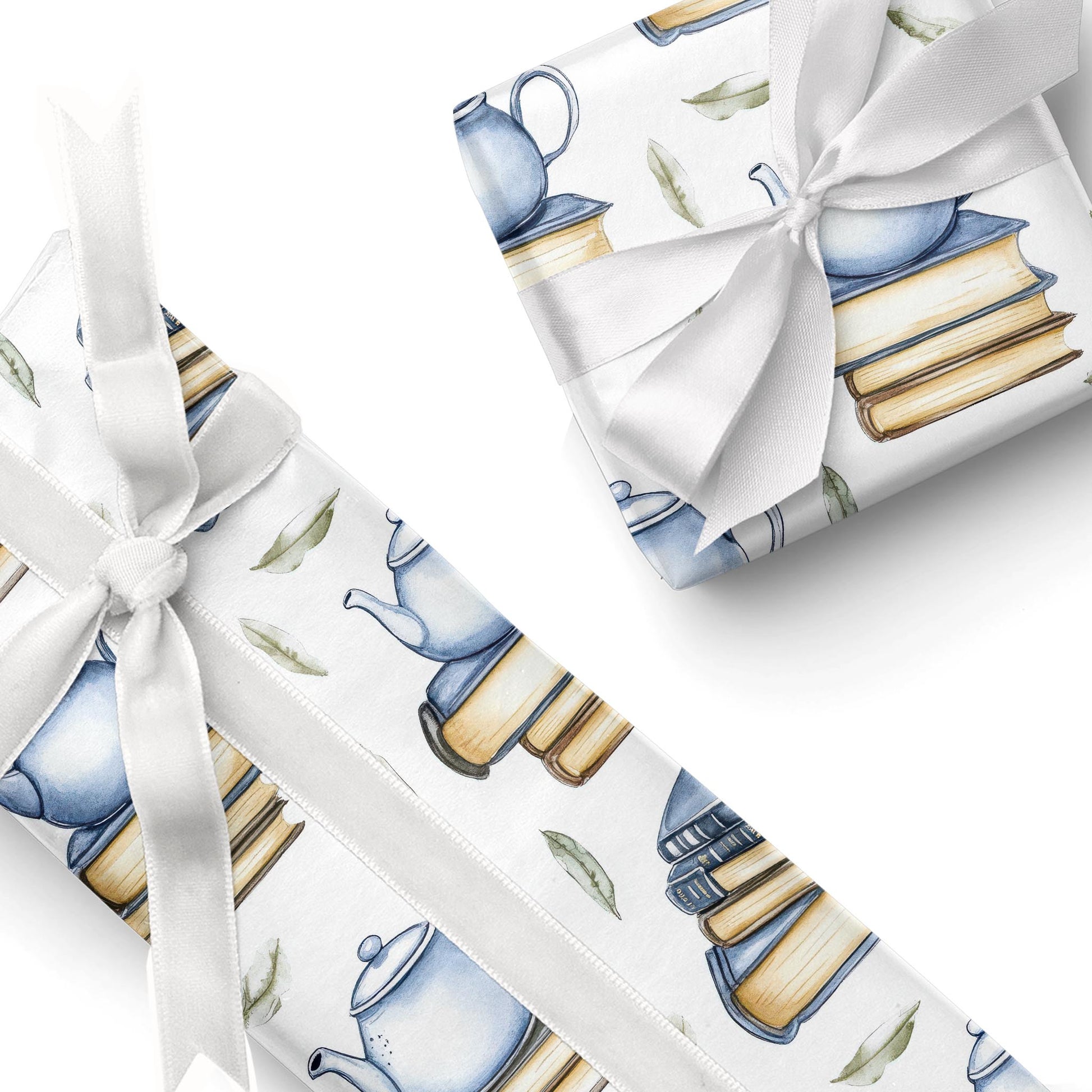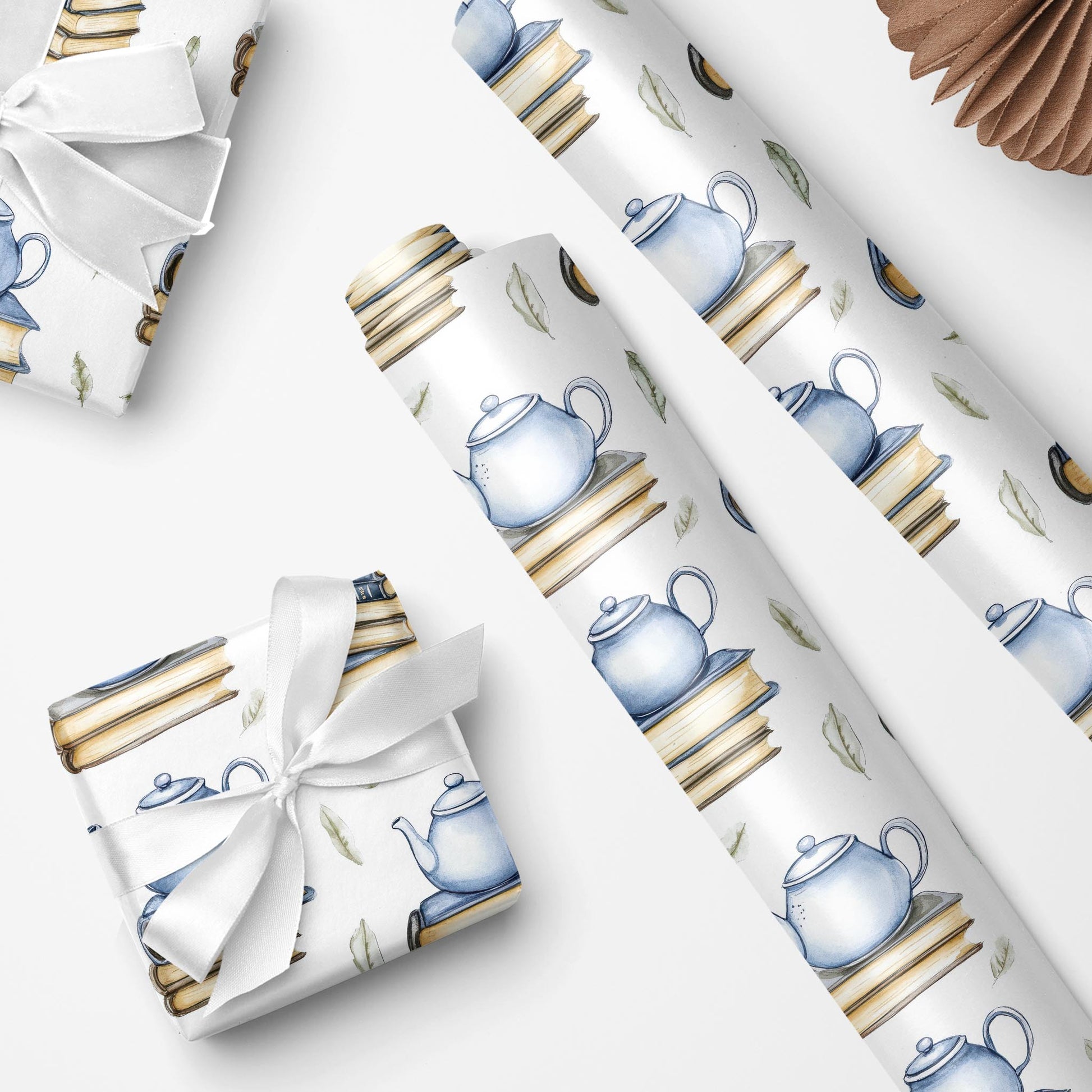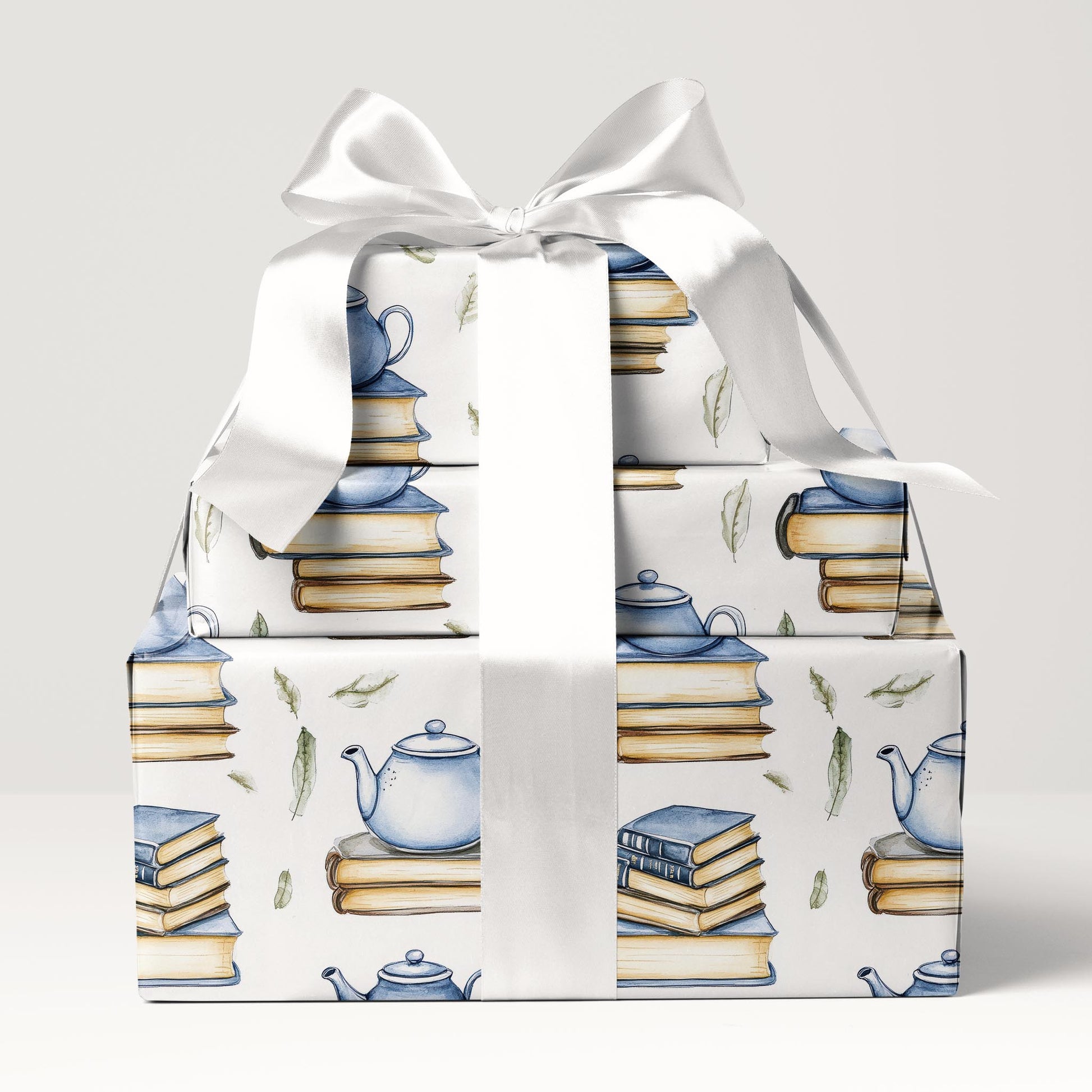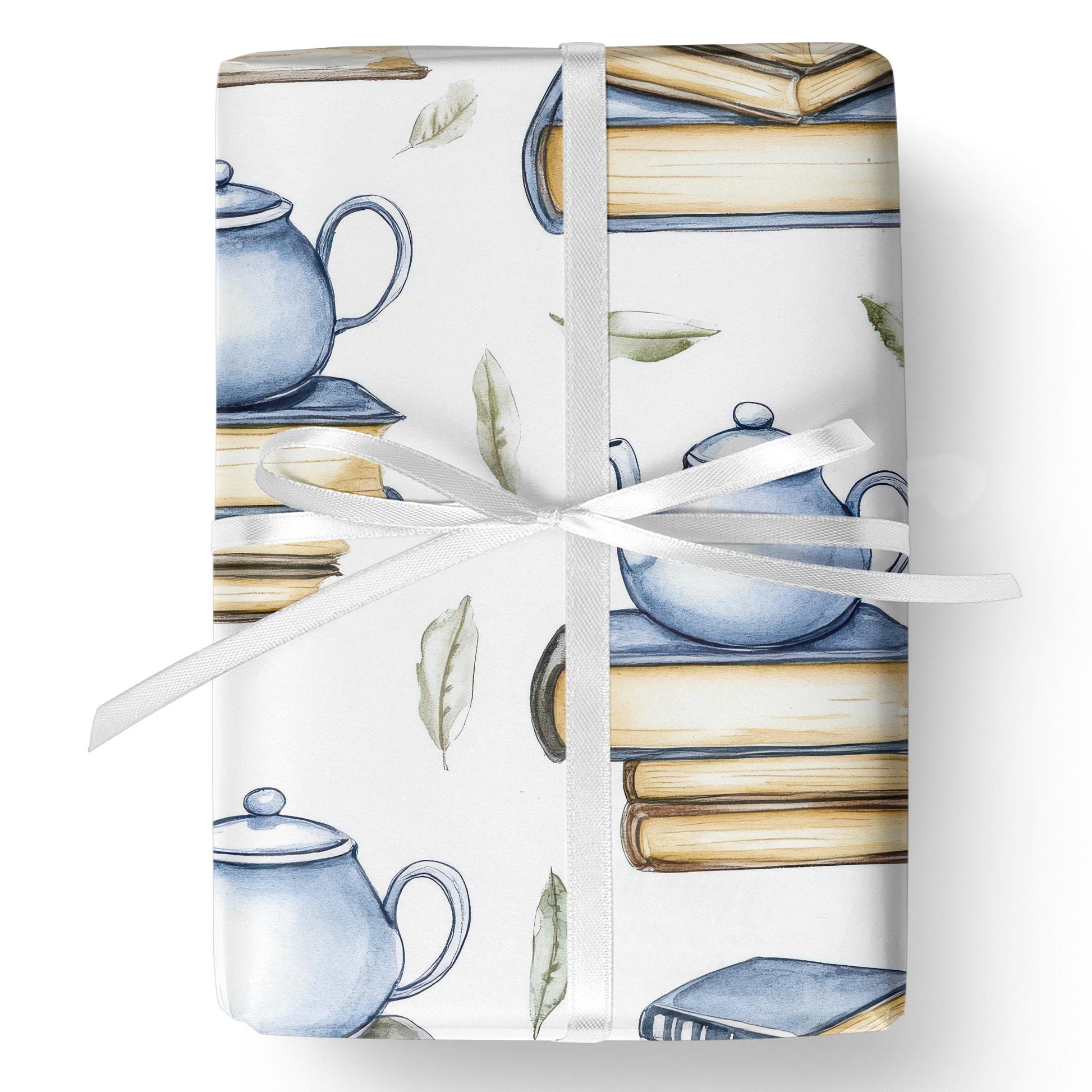 Blue teapots rest atop book stacks in this whimsical repeat. Teatime Tales is a charming wrap for tea lovers, birthdays, and cozy gifts for readers.