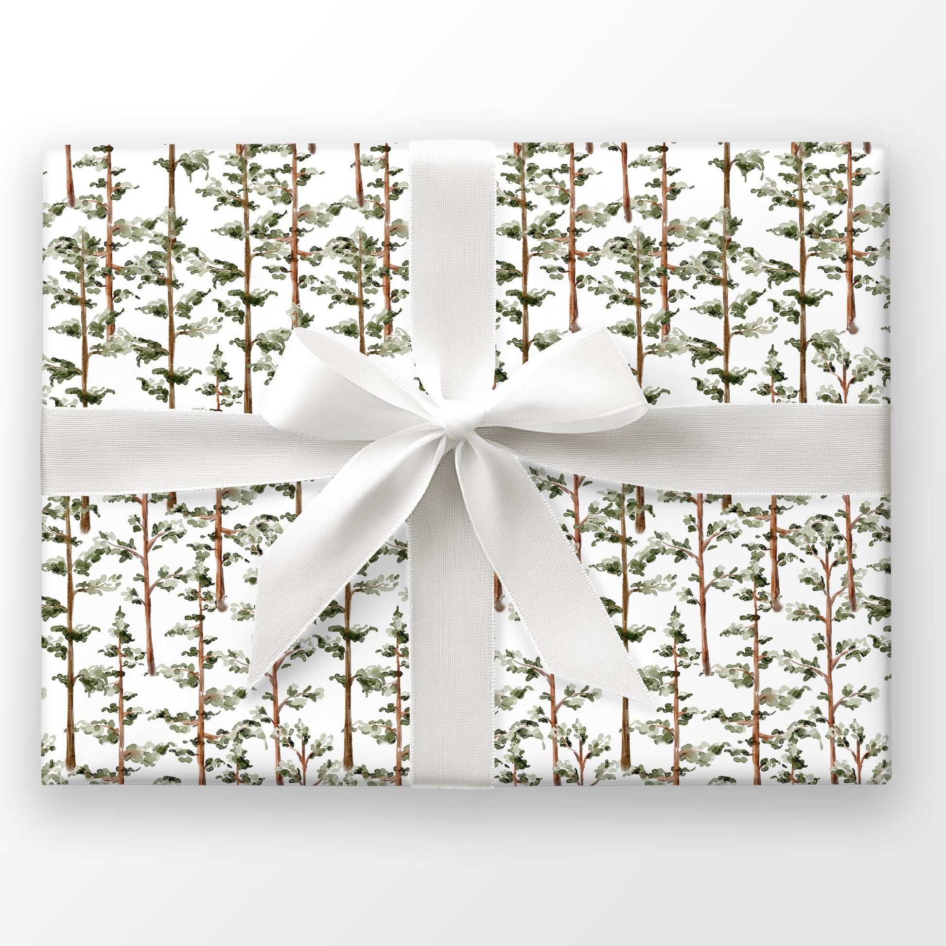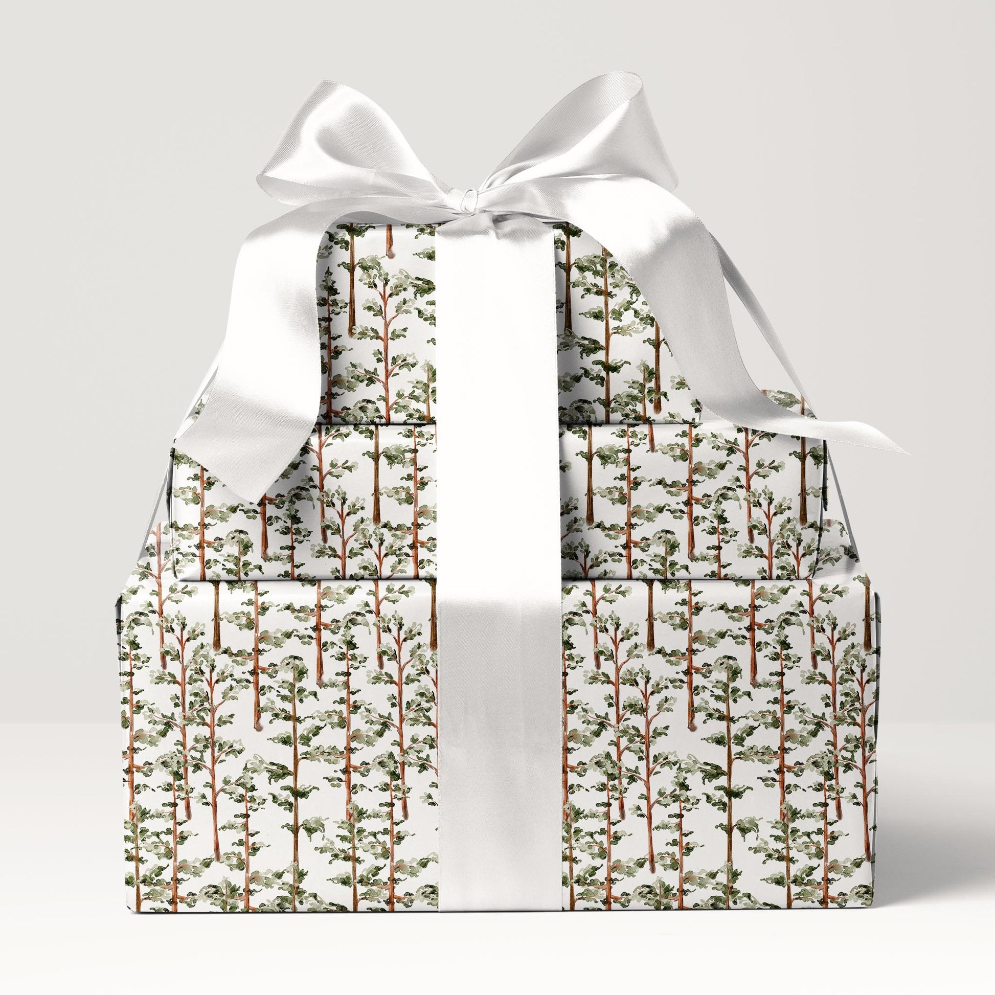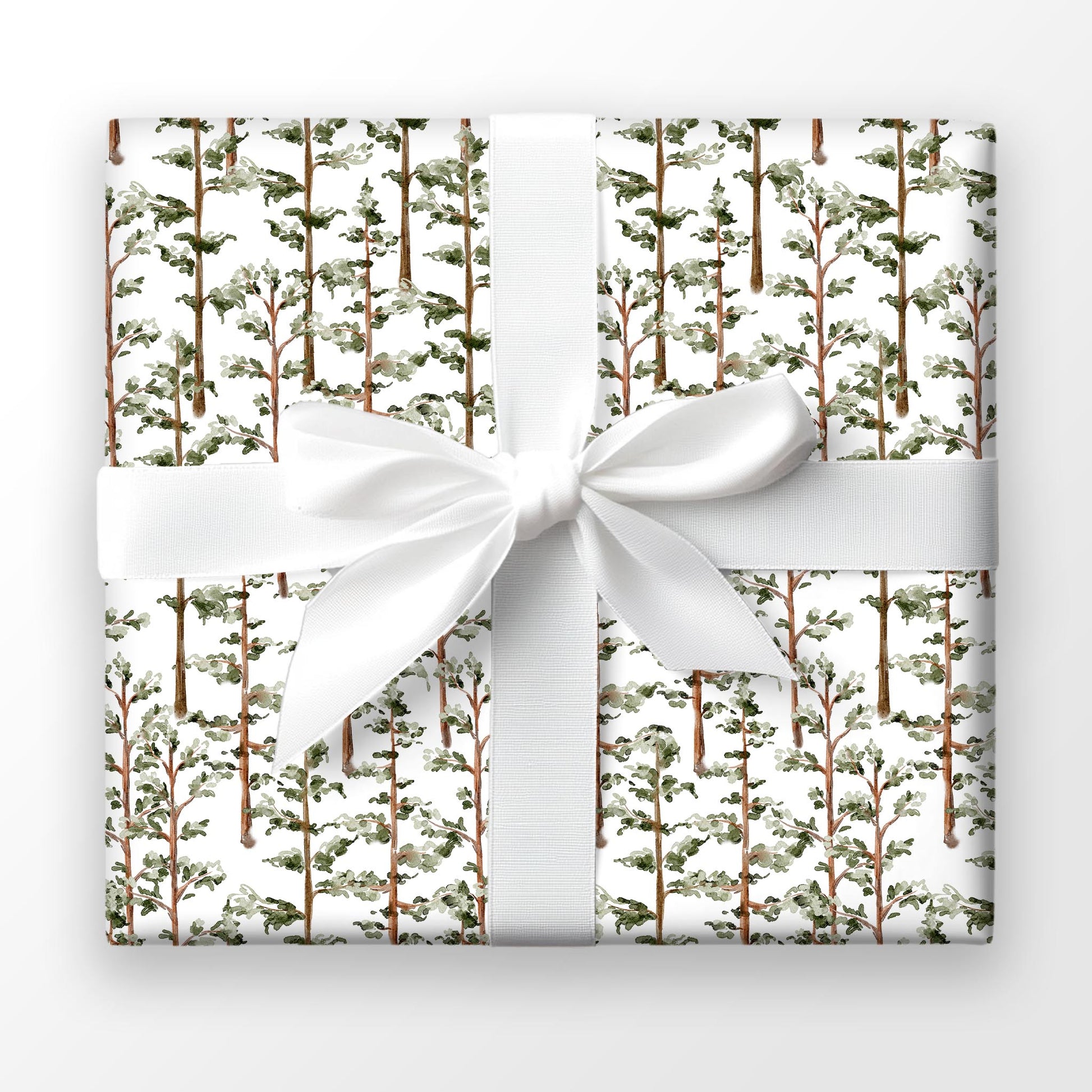 Wrap with natural rhythm. Timberline Walk lines up tall, slender evergreens in a forest-like pattern on crisp white — a structured, masculine wrap for Christmas, Father’s Day, or nature-inspired gifting.