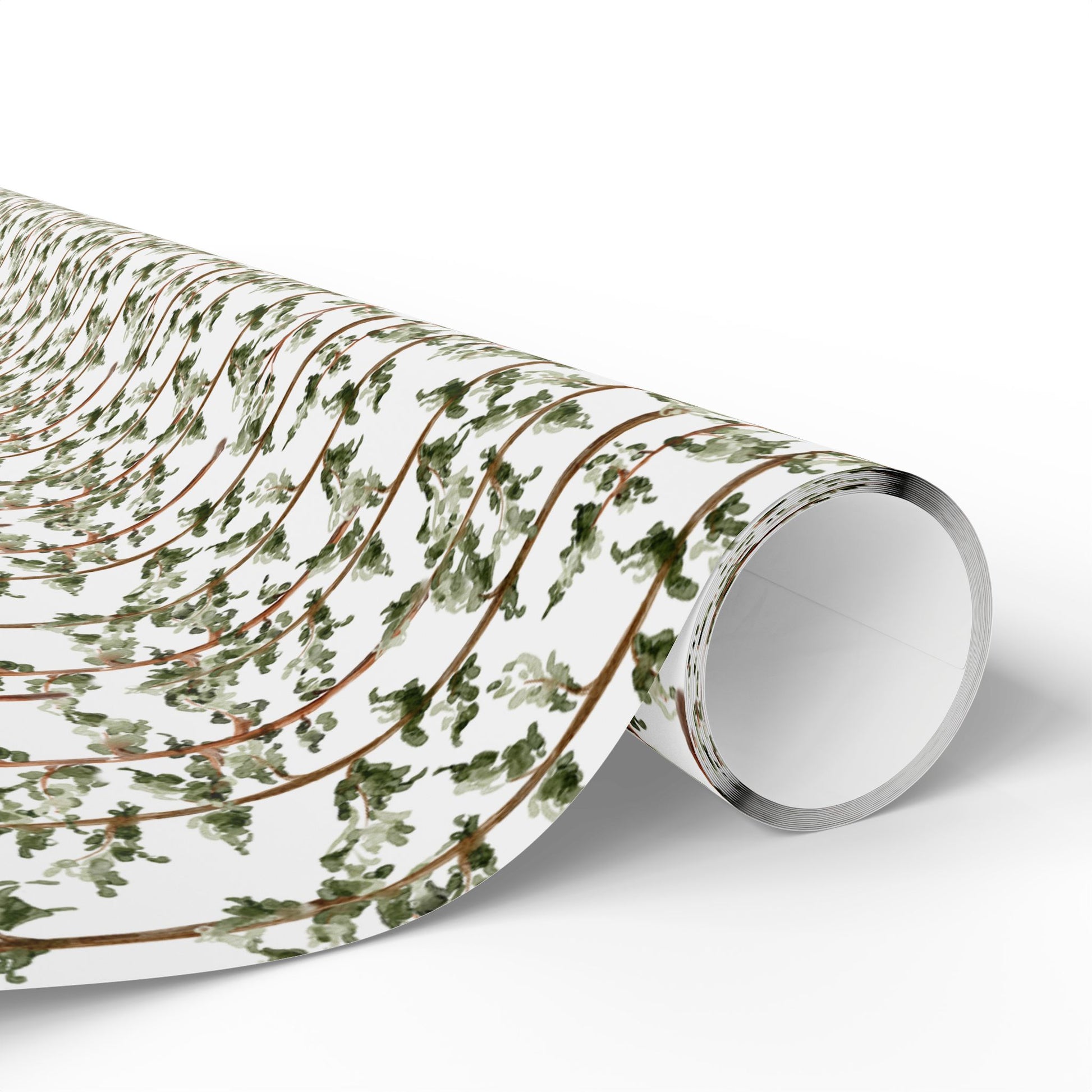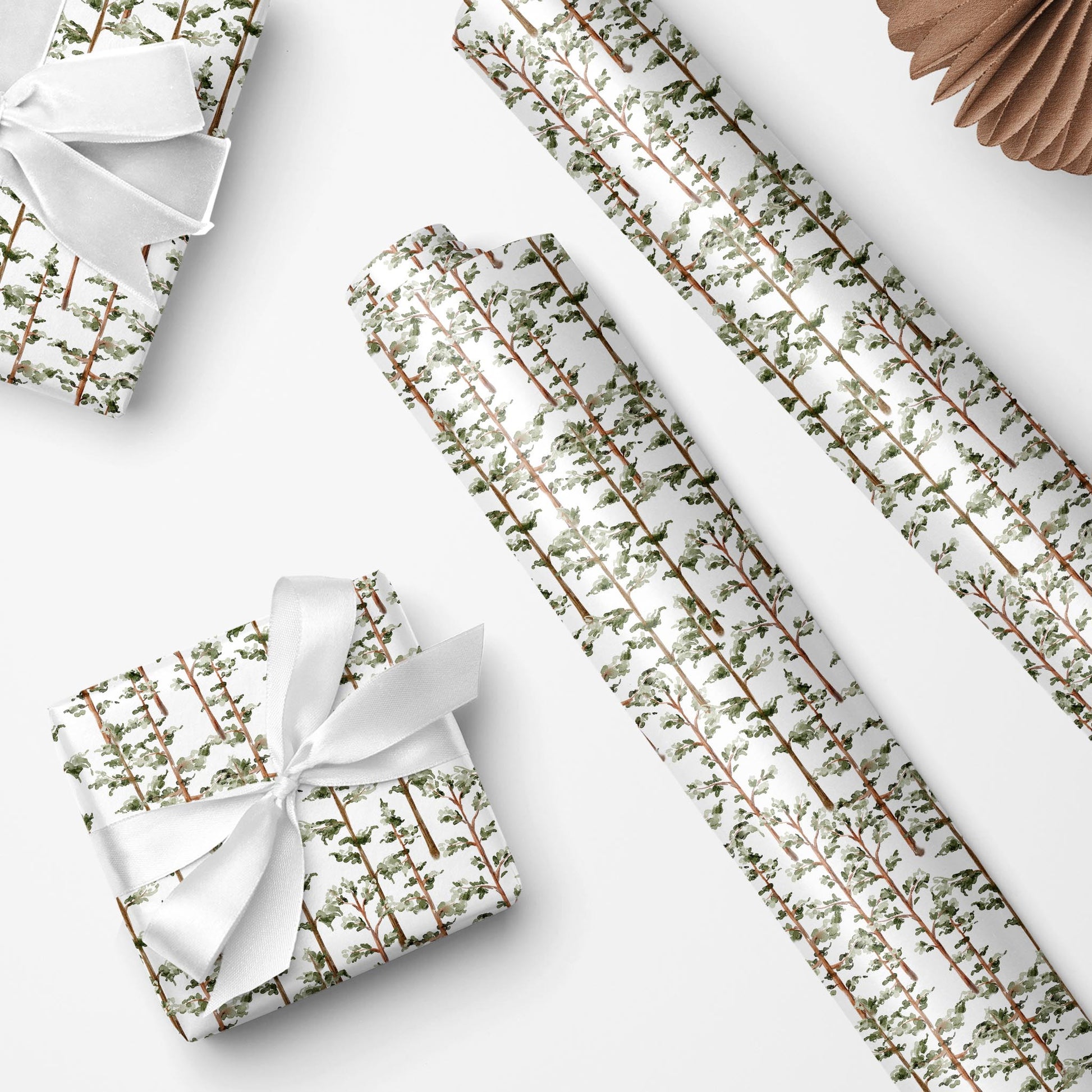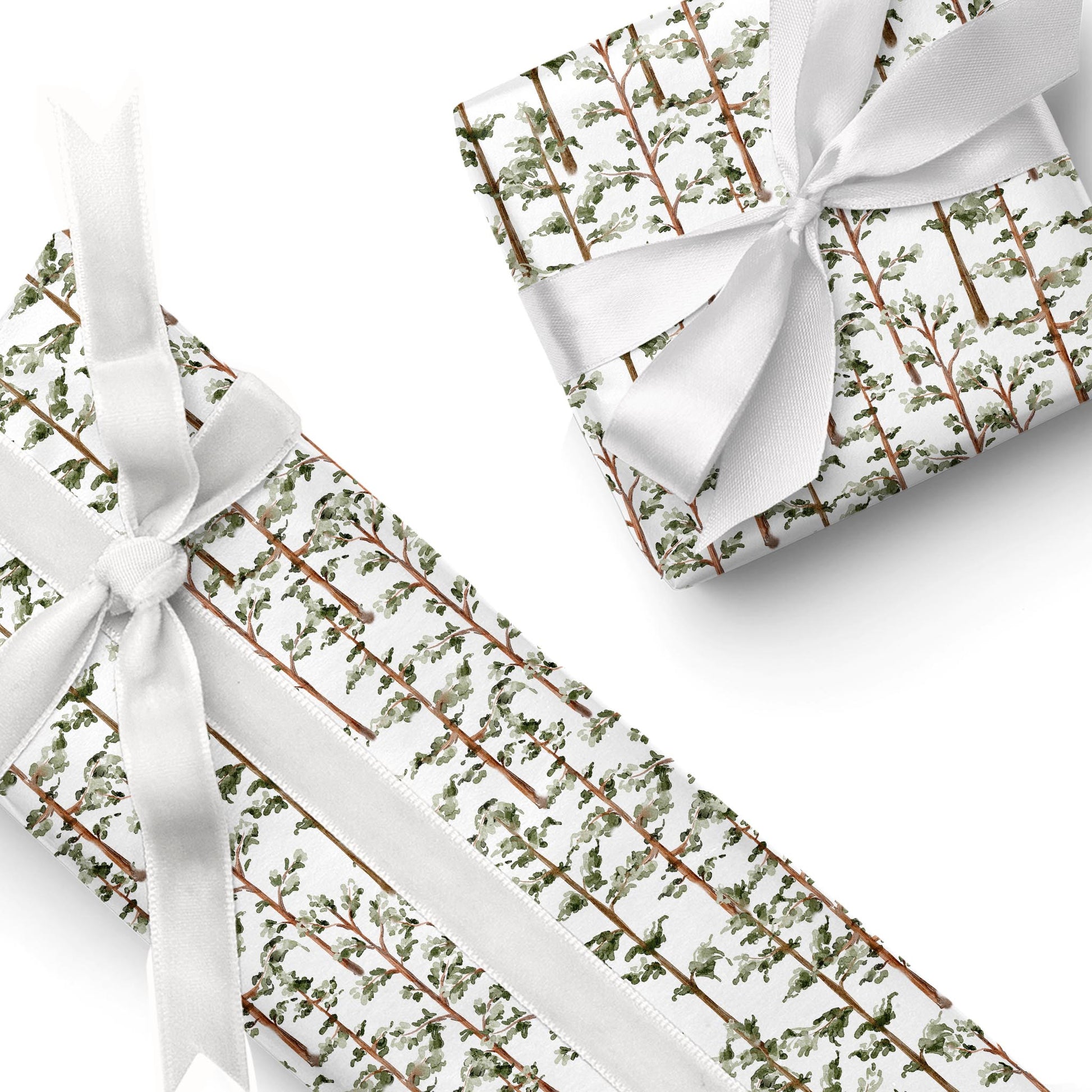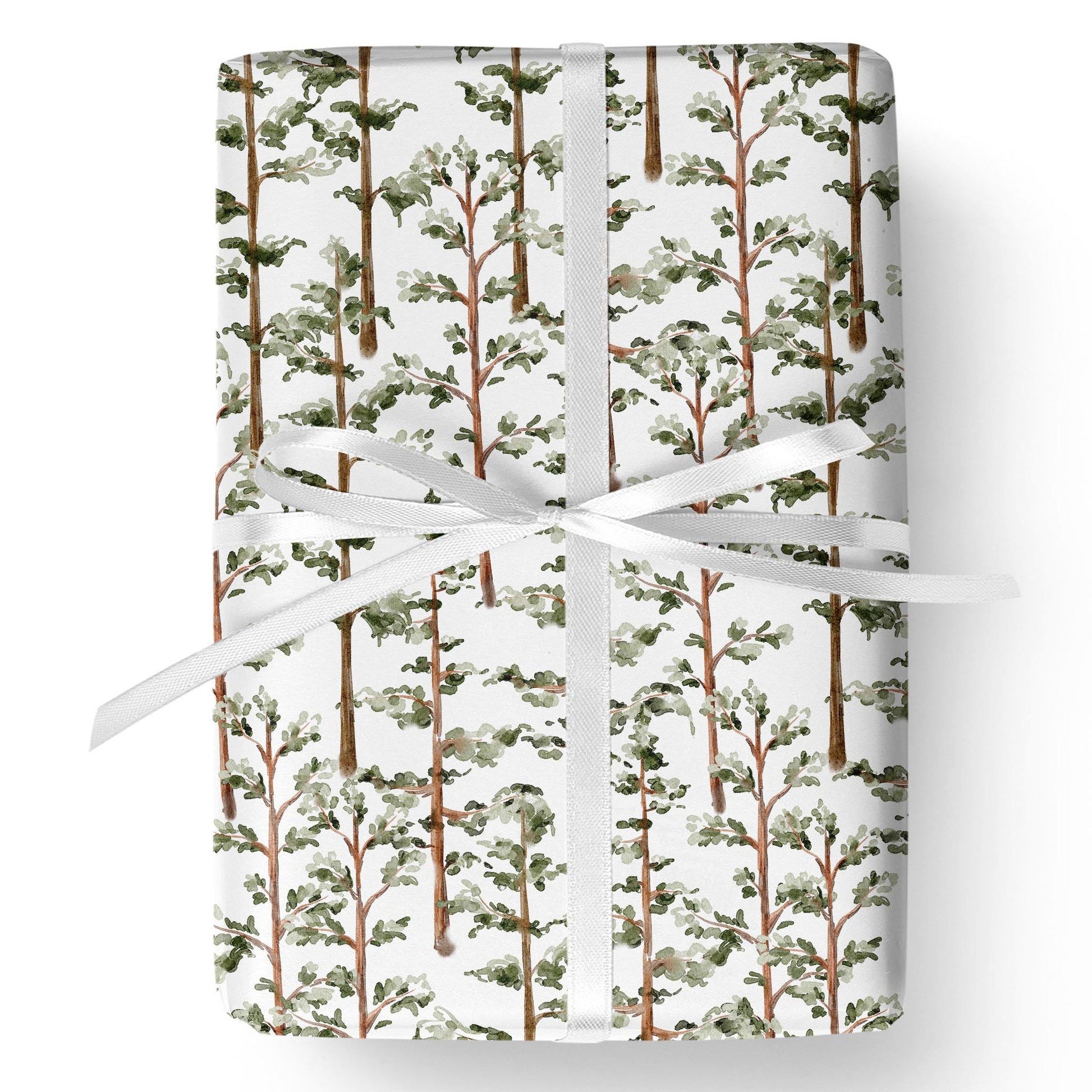 Wrap with natural rhythm. Timberline Walk lines up tall, slender evergreens in a forest-like pattern on crisp white — a structured, masculine wrap for Christmas, Father’s Day, or nature-inspired gifting.