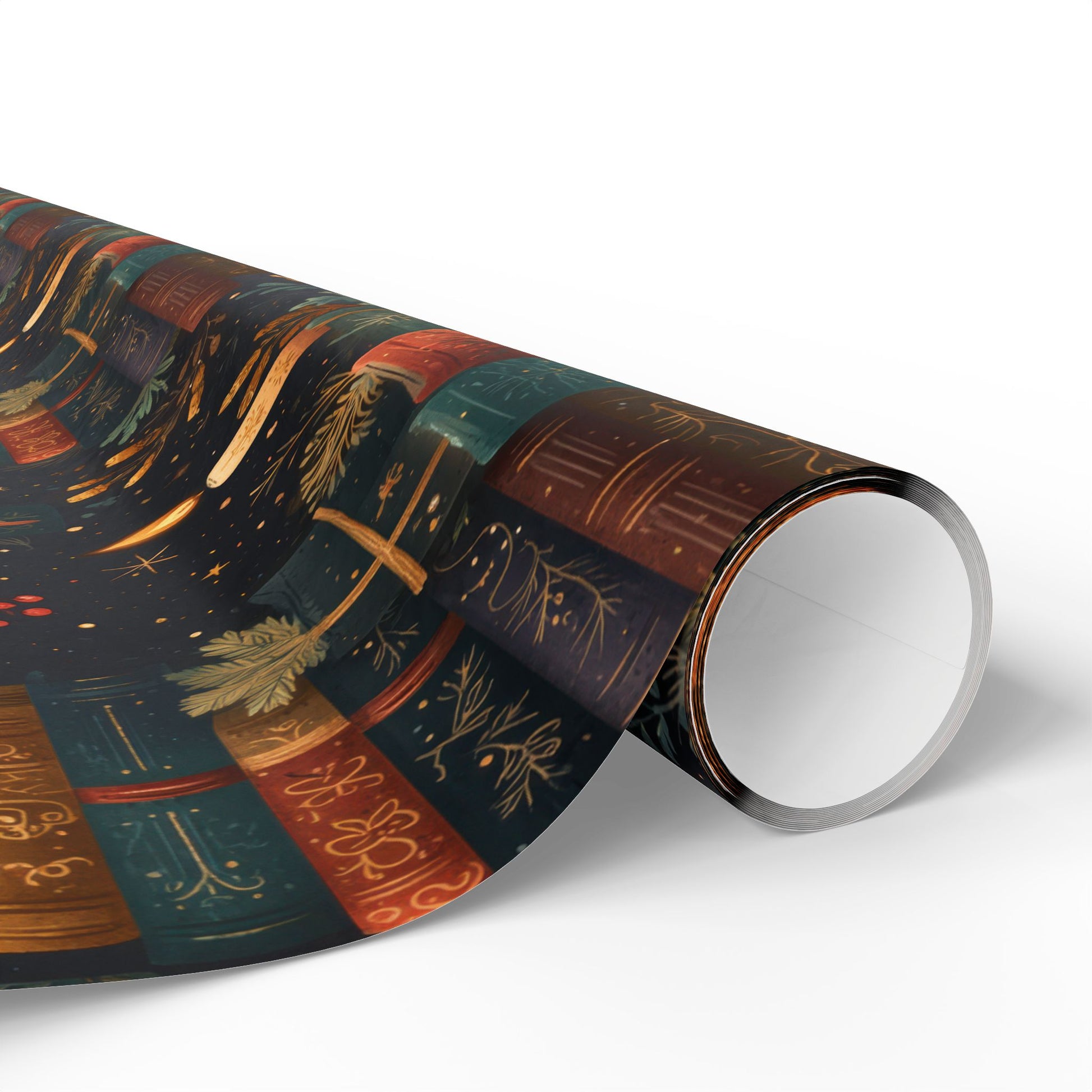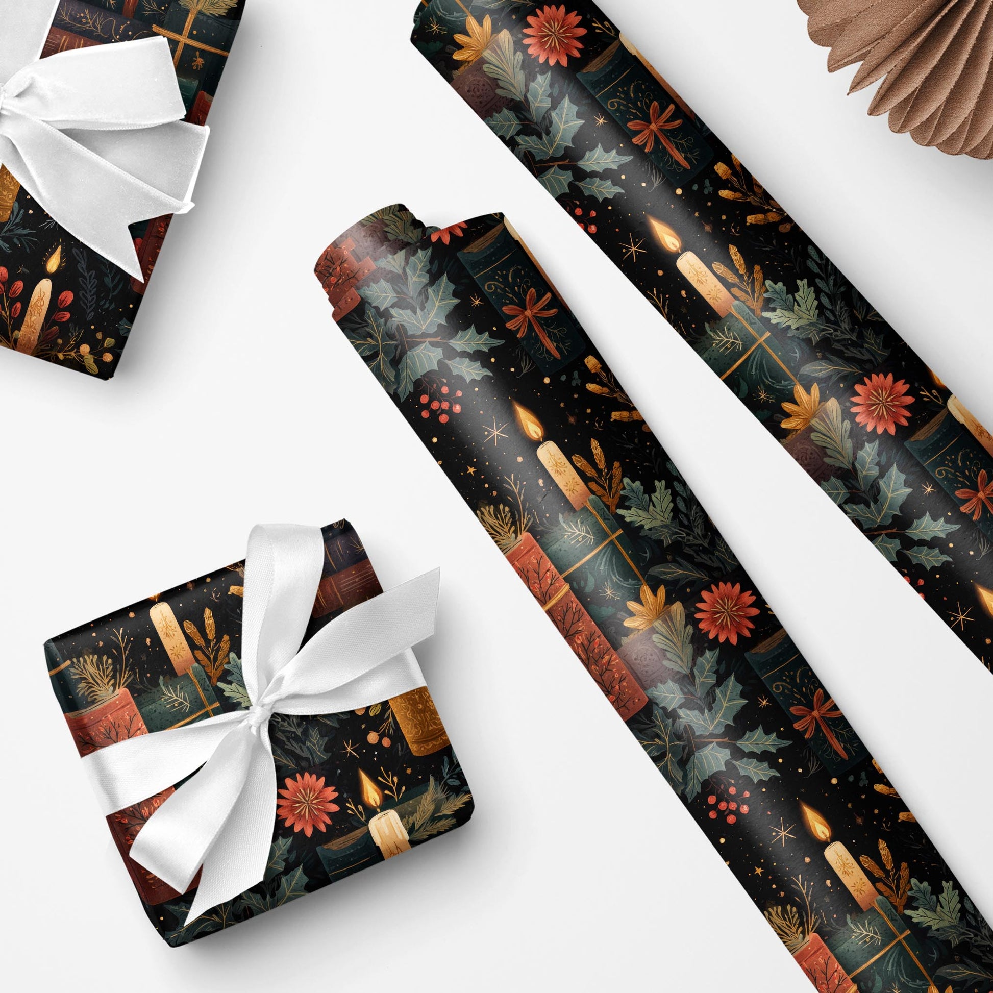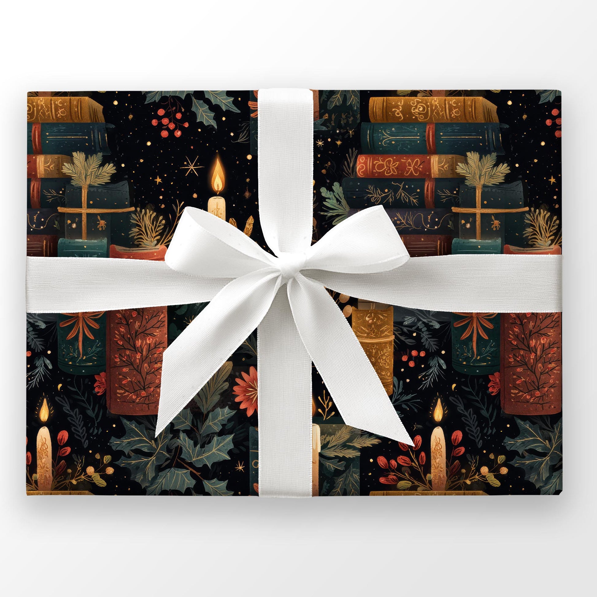 Holly, ivy, and glowing candles crown stacks of classic tomes. Yuletide Tomes is a festive wrap for readers and cozy Christmas gifting.